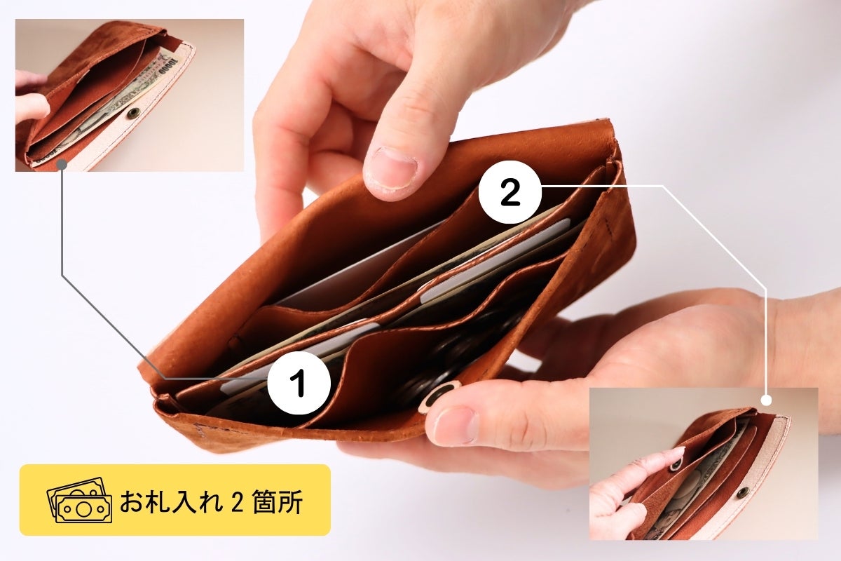 ひとまわりコンパクトながら、使いやすさと収納力をしっかり確保。素材は、日本唯一の国産革**「豚革スエード」。「薄くても強い」「軽くてしなやか」「手に馴染む」── そんな特性を活かし、前作よりも革1枚分の軽量化**を実現しました。
