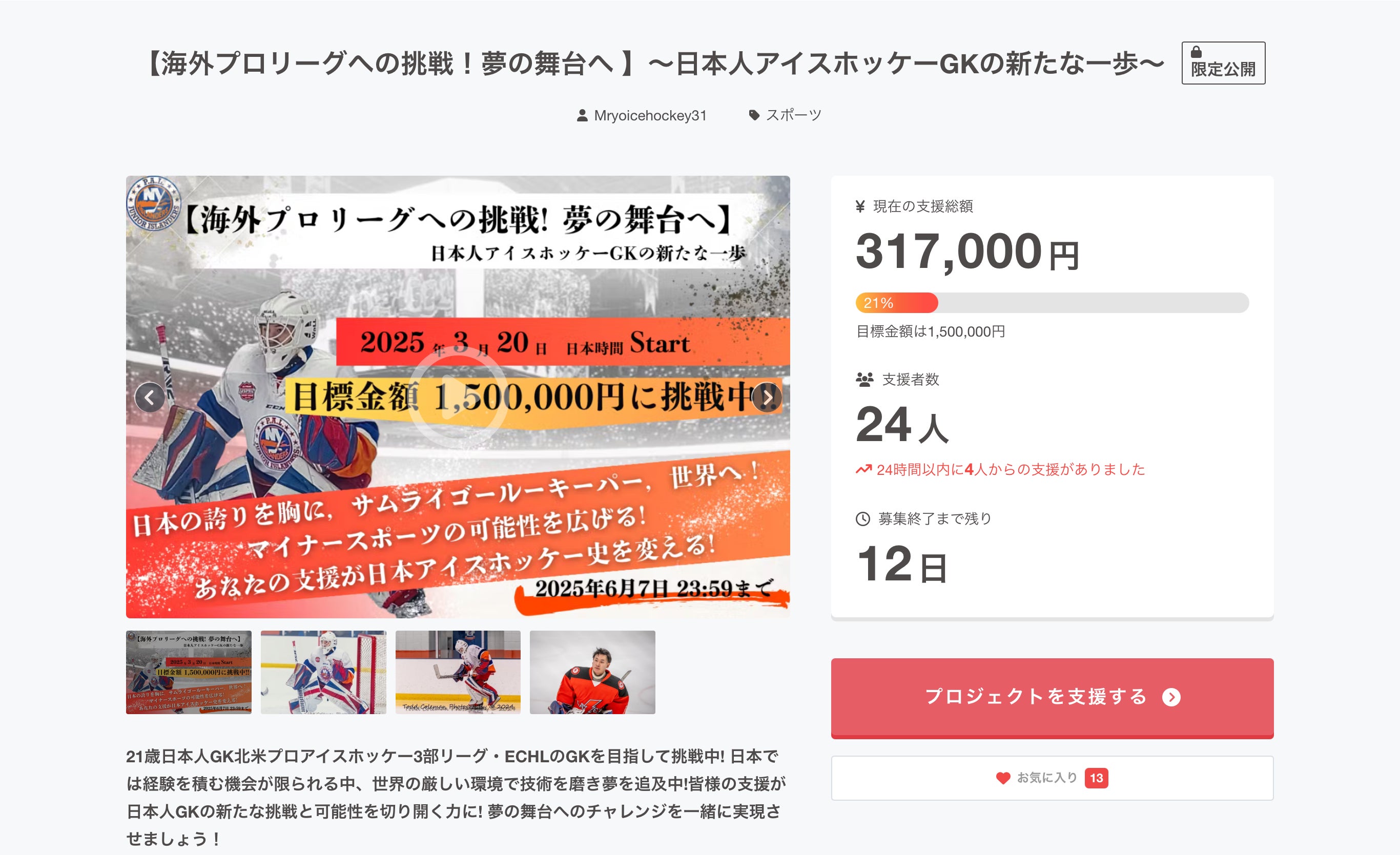 『【海外プロリーグへの挑戦!夢の舞台へ】〜日本人アイスホッケーGKの新たな一歩〜』は、プロジェクト終了まであと2週間を切りました!