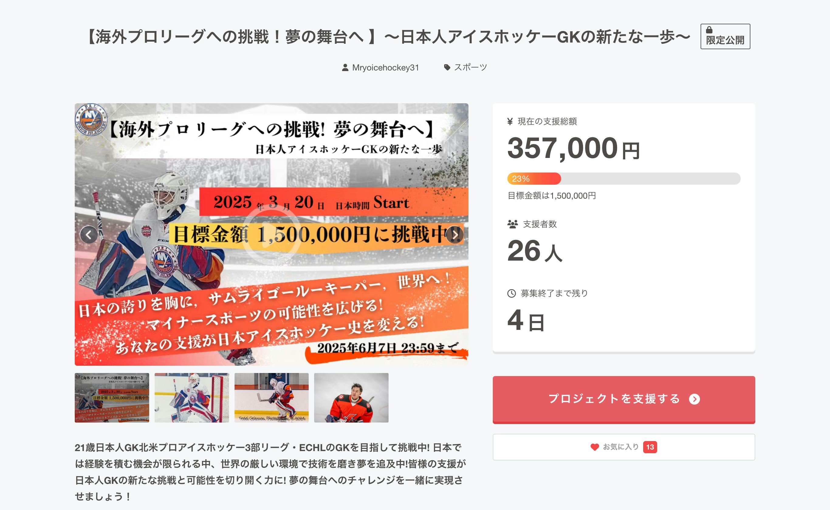 活動報告【クラウドファンディング Day 77】皆さま、こんにちは!クラウドファンディングプロジェクト「海外プロリーグへの挑戦!夢の舞台へ」を立ち上げた日本人アイスホッケーゴールキーパーの村上諒です!現在、アイスホッケーのゴールキーパーとして、海外のプロリーグに挑戦するためのクラウドファンディングプロジェクトに挑戦しています!3月20日にスタートしたクラウドファンディングプロジェクト『【海外プロリーグへの挑戦!夢の舞台へ】〜日本人アイスホッケーGKの新たな一歩〜』は、プロジェクト終了まで残り3日間となりました!25人の支援者様たちより沢山のご支援をいただいております。また、応援してくださる方々にも感謝しております。現在の支援額は337,000円(達成率22%)となりました!目標金額の1,500,000円までは、あと1,163,000円!クラウドファンディング終了まで、残り3日間です!現在の支援状況をご報告します。- 公開から77日目- 支援金額:357,000円- 目標金額:1,500,000円- 達成率:23%- 終了まで残り日数:3日本文現在までのご支援、本当にありがとうございます。開始当初は、どれだけこのプロジェクトへ支援をいただけるか不安もありましたが、皆様のおかげで僕一人の力では到底届かない場所に、皆さんの応援のおかげで少しずつ近づいていると感じています。目標金額には届いていませんが、ラストスパートに向けて力を尽くします。今はまだマイナースポーツかもしれませんが、僕の挑戦を通じて、一人でも多くの方にこの競技の魅力が届いたら嬉しいです。今この瞬間も、SNSでのシェアやお知り合いへのご紹介が、とても大きな力になります。「こんな選手がいるんだ」と知ってもらえるだけでも前進になります。こんな方にぜひ知ってほしいプロジェクトです:▶︎ アイスホッケーをしている、あるいは興味のあるお子さんを持つご家庭▶︎ 若い選手の挑戦を応援したいというスポーツ支援者の皆さん▶︎ 海外に挑戦する日本人選手の姿に可能性を感じる企業・団体様子ども向けに追加したリターンも、数量限定でご用意しています。サイン入りの試合用ユニフォームやカスタム防具、キャップなど、ここでしか手に入らないアイテムです。法人・企業様向けのリターンもご用意しております。スポンサーとしてのご支援に加え、SNSや活動報告でのPR・御礼掲載など、ご希望に応じた形でご提案可能です。社会的な意義のあるパートナーシップを築けたら嬉しいです。ぜひお気軽にお問い合わせください。このクラウドファンディングが、アイスホッケーを知らなかった人にとって新しい発見となり、ホッケーに夢を持つ子どもたちの“きっかけ”になればと願っています。いまこのページを見てくださっている皆さん。もし少しでも心が動いたら、ぜひシェア・拡散やご支援をお願いします!最後に僕は今、フィンランドでのシーズンを終え、次のシーズンに向けて準備を進めています。このクラウドファンディングを通じて、次のステージへ挑戦するための環境を整え、さらに世界で経験を積んで、日本のホッケー界に還元したいという強い気持ちで活動しています。15歳で初めて飛び出した海外への挑戦。その時の「何も知らない純粋さ」は今でも僕の原動力です。しかし今回の挑戦は、より大きな責任と使命を帯びています。今回のクラウドファンディングは、単なる「個人の夢」への支援ではなく、「日本のアイスホッケーの未来」への投資だと考えています。僕の経験と学びが、次世代の選手たちへと繋がっていくことを約束します。支援してくださった一人ひとりの思いを胸に、必ず海外での挑戦を実現させます。そして、その経験を日本に持ち帰り、次世代のアイスホッケー選手たちに還元します。クラウドファンディングの道のりはまだ続きますが、一つひとつの支援に感謝しながら、目標達成に向けて全力で取り組みます。皆さんの応援に心より感謝し、今後とも温かいご支援をお願いいたします。この挑戦は、僕一人のものではありません。支えてくれる方々がいるからこそ、僕は前に進めています。「スポーツで世界を目指す若者がいる」「言葉も文化も違う場所で夢を追いかけている」そんな姿に少しでも何か感じていただけたら、ぜひクラウドファンディングページをご覧いただき、応援いただけたら嬉しいです。クラファンは1,000円から支援可能です。ご支援いただいた方には、想いを込めたお礼をしっかりと届けます。もしご支援が難しくても、この投稿をSNSでシェアしていただけるだけでも大きな力になります!どうか、あなたの力を貸してください!皆さまからのご支援、SNSでのシェア、応援メッセージ、どれも大きな力となります。引き続き、ご支援と応援のほどよろしくお願いいたします。▼プロジェクトページはこちらCAMPFIRE最後まで読んでくださり、ありがとうございました!引き続きよろしくお願いいたします!村上諒