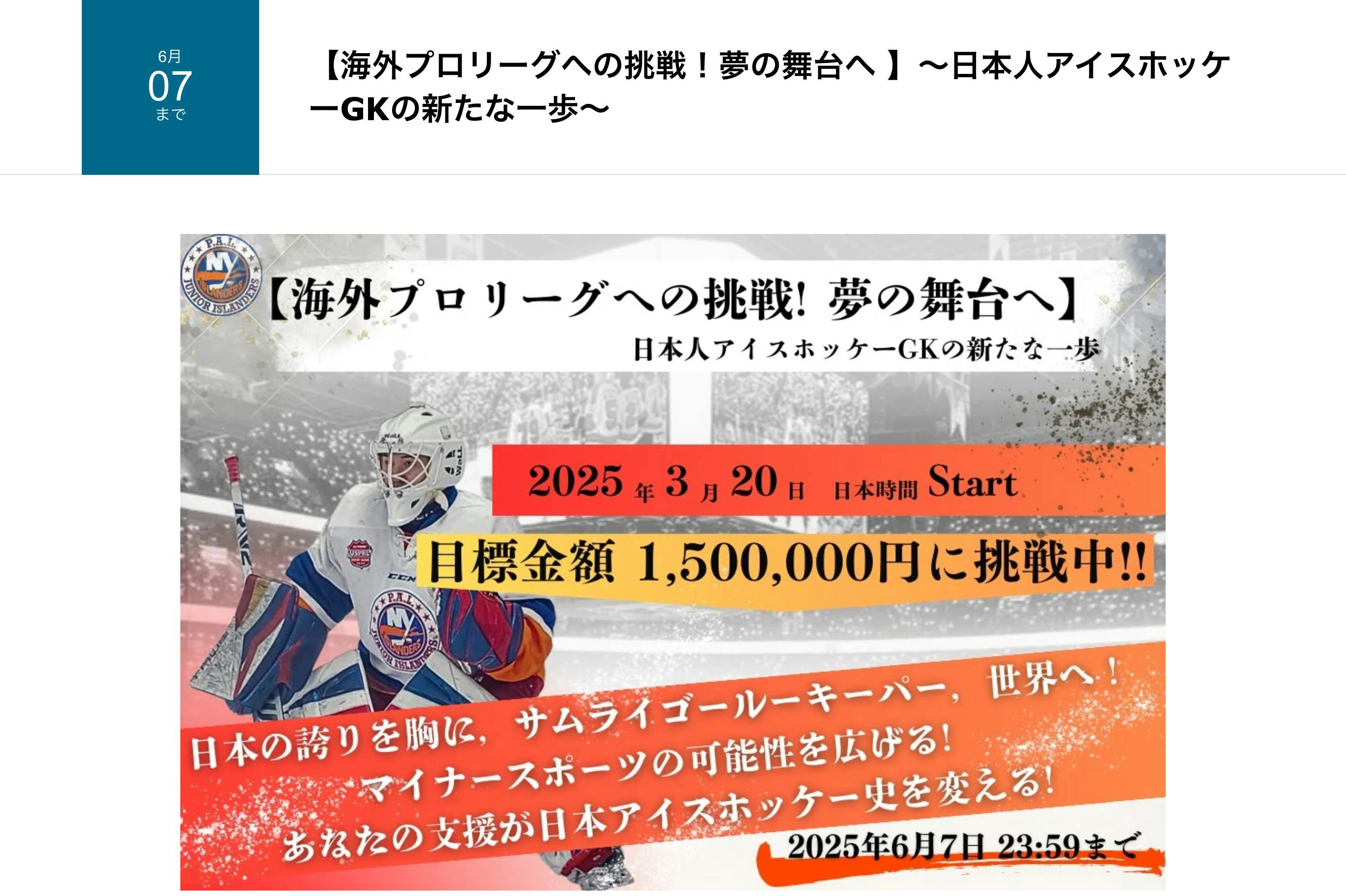 【活動報告】【クラウドファンディング8日目】皆さま、こんにちは!プロジェクト「海外プロリーグへの挑戦!夢の舞台へ」を立ち上げた日本人アイスホッケーゴールキーパーの村上諒です。現在、アイスホッケーのゴールキーパーとして、海外のプロリーグに挑戦するためのクラウドファンディングプロジェクトに挑戦しています。現在の支援状況をご報告します。- 公開から8日目- 支援金額:49,000円- 目標金額:1,500,000円- 達成率:3%- 終了まで残り日数:72日【海外プロリーグへの挑戦!夢の舞台へ】〜日本人アイスホッケーGKの新たな一歩〜このクラウドファンディングプロジェクトを3月20日 0:00(日本時間)に公開してから、今日で8日目となりました!まず初めに、ページを見てくださった皆さま、SNSでシェアしてくださった方、そして支援してくださった皆様に、心から感謝申し上げます。一人一人のご支援が私の背中を押してくれています。数字だけ見るとまだ道のりは長く見えるかもしれません。でもこの「3%」の裏には、確実に届いている想いがあります。この8日間で、僕のプロジェクトをより多くの方々に知っていただくために、SNSを通じた情報発信や、アイスホッケー関係者の方々との交流を積極的に行ってまいりました。また、支援者の皆様からのご意見やアドバイスを取り入れ、プロジェクトの内容をより充実したものにするための改善を重ねています。『アイスホッケーを100倍楽しむコツ』【アイスホッケーの魅力】これまでの活動報告を通して、「アイスホッケーに興味はあるけれど、ルールがわからない」というお声をいただきました。そこで今日は、アイスホッケーを100倍楽しむための基礎知識をご紹介します!「アイスホッケーって何が面白いの?」というところから!今日はアイスホッケーの魅力を初心者の方にもわかりやすくお伝えします!アイスホッケーは「氷上の格闘技」と呼ばれるほど、スピード感とパワーに満ちたスポーツです。選手は時速40km以上で滑り、パックは最高時速160kmで飛んでいきます。アイスホッケーとは?アイスホッケーは、氷上で6人対6人(GK1人、フィールドプレーヤー5人)が、スティックを使ってパック(硬質ゴム製の円盤)を相手ゴールに入れるスポーツです。スピード感、駆け引き、チームワーク、そして時には体の激しいぶつかり合い(チェック)も含めた、まさに「氷上の格闘技」とも呼ばれる熱いスポーツです。試合の流れ試合は20分×3ピリオド制。ピリオド間には休憩があります。同点で終了した場合は、延長戦やシュートアウト(PK戦に近いもの)で勝敗を決します。選手は短い時間で交代を繰り返すため、氷上にいる時間は一度に約40秒〜1分程度。その短い時間で最大限の力を発揮します。ゴールキーパーの役割GKはチームで唯一、スティック以外に手や体を使ってパックを止めることができる選手です。ゴールエリア(クリース)を中心にシュートをセーブします。観戦のポイントアイスホッケー観戦の醍醐味は、そのスピード感と予測不可能な展開です。初めて観る方へのポイントをいくつかご紹介します:⒈ パックだけを追わない:パックの動きだけでなく、選手の配置や動きにも注目すると、戦術が見えてきます。2. GKの動き:シュートが放たれる前から、GKがどのようにポジションを取り、準備しているかを観察すると、GKの技術の奥深さが理解できます。3. 音に注目:スケートの氷を削る音、スティックがぶつかる音、ボードに当たる音など、音の世界も楽しみの一つです。4. 流れの変化:アイスホッケーは一瞬で流れが変わるスポーツ。劣勢に見えてもゴール1本で試合が動くことも多々あります。観戦のポイントは、まずパックの動きを追うのではなく、選手の動きに注目すること。特に「オフザパック」(パックを持っていない選手)の動きに魅力が詰まっています。僕たちGKは常に氷上の全体を見渡し戦況を見ながら、チームメイトに指示を出し、最後の砦として立ちはだかります。そのため,常に緊張感を持ってプレーしています。一瞬の判断ミスが失点につながる、まさに孤独な戦いです。ゴールを決められた瞬間は辛いですが、そこから学び、次に活かす。このタスクフォーカスを僕なりに海外の経験で強くしてきました。皆さんの応援が僕の挑戦を支えています。これからも日本人GKとしての挑戦を発信していきます。【GKを6歳から続けてきた理由】僕がGKを続けてきた理由は、この「ゴールを守る喜び」にあります。チームのために身を投げ出し、ゴールを死守する。その責任感と充実感が私を成長させてきました。海外のプロリーグでは、GKに求められる技術や体格、そして精神力のレベルはさらに高くなります。日本人GKとして、その世界で戦うことで、日本のアイスホッケーの可能性を広げたい。そんな思いで挑戦しています。僕はこれまで、3歳からホッケーを始め、北海道の小さな町から、カナダ、アメリカ、そして今フィンランドという世界へと挑戦の場を広げてきまし