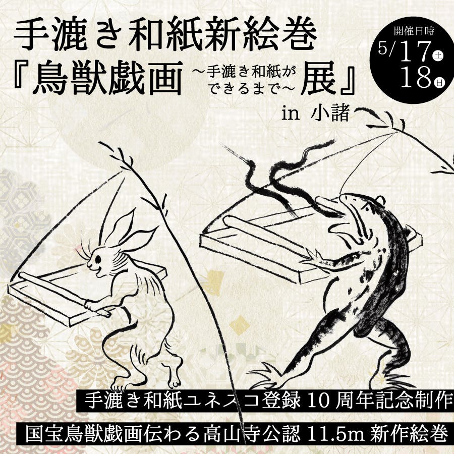 こんにちは、番頭の川口です。今期ご参加頂き、またご支援頂き、誠にありがとうございます。まだクラウドファンディングでの参加者募集中ですが、京都に次いで、絵巻を描いた地長野県小諸にて、手漉き和紙鳥獣戯画展を開催いたします。長野県では、神社でトロロアオイを育てていただき、職人さんに漉いていただいた和紙を御朱印にする取り組みが始まっています。また、小諸では神社、お寺の住職が集まって取り組みをしている寺社会があり、そのような活動を見て、京都・高山寺さんから、小諸で描いたら面白いのではと話になり、今回の手漉き和紙絵巻鳥獣戯画を小諸の海應院で描きました。本来は、昨年の京都展示会後に、国宝・鳥獣戯画を伝える高山寺に奉納する予定でしたが、高山寺さんよりとても良い作品なので、色々な産地で見て頂いてからでもとお話があり、最初に描いた地・小諸で開催することとなりました。今回、開催にあたり、寺社の御朱印を漉いていただいてます内山紙(長野県)の職人さんにも来ていただき、体験もできるようにしています。もし、お近くにお住まいであったり、お時間がありましたら、お立ち寄りください。詳細はこちら。
