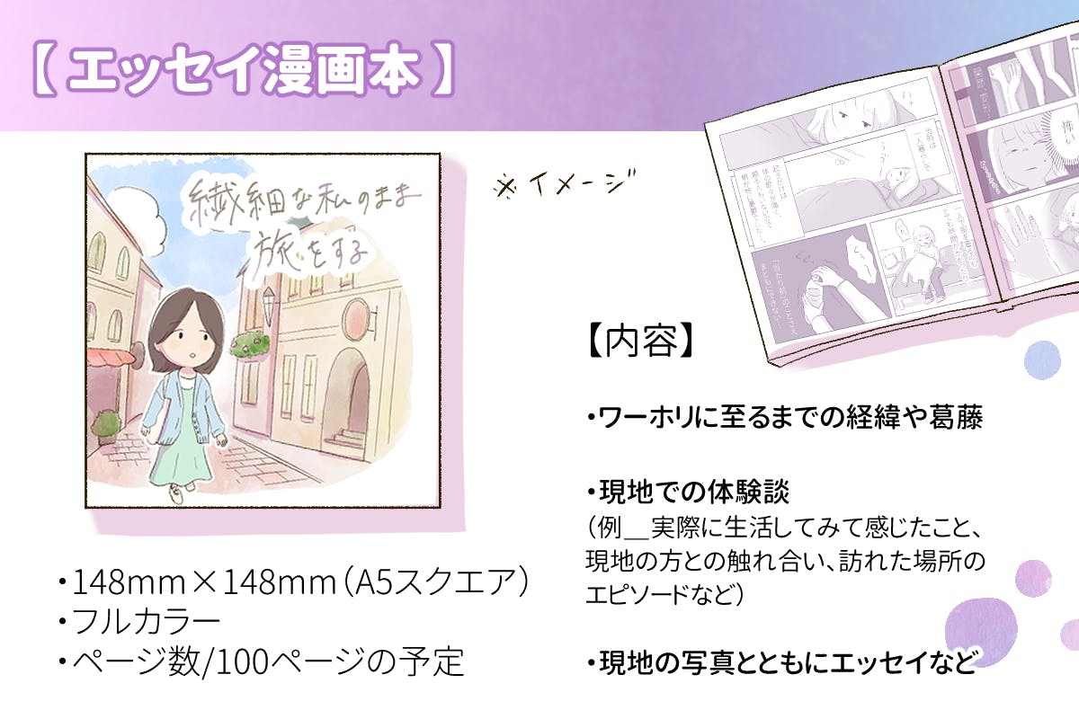 ワーホリ終了後に、エッセイ漫画本を制作する予定です。旅の最中でもSNSでの発信やブログでの情報発信は行います。内容は重複するかもしれませんが、エッセイ漫画本ならではのオリジナルコンテンツも盛り込みたいです。また紙の材質ならではの、「あたたかさ」も本を通してお届けしたいです。