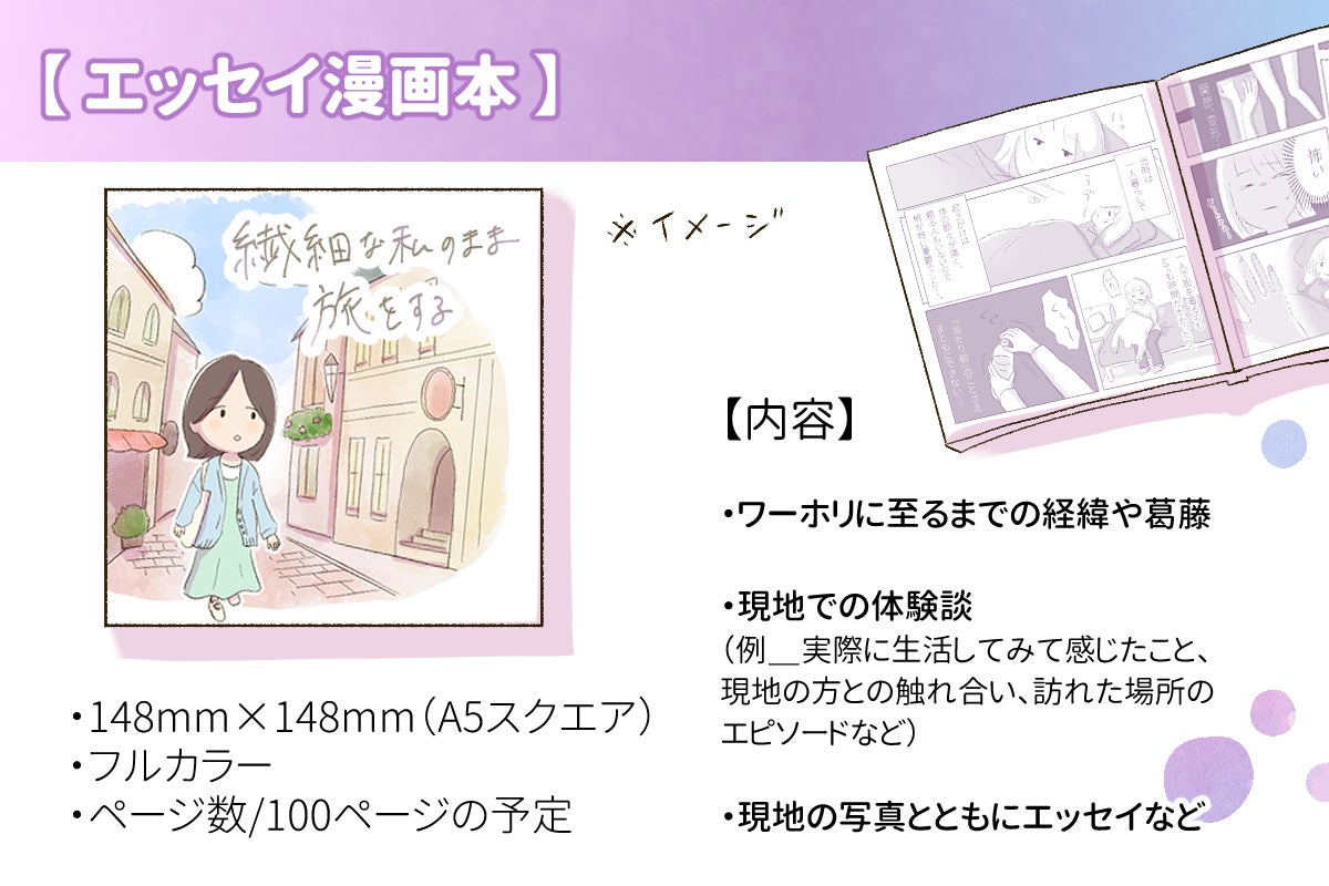 ワーホリ終了後に、エッセイ漫画本を制作する予定です。旅の最中でもSNSでの発信やブログでの情報発信は行います。内容は重複するかもしれませんが、エッセイ漫画本ならではのオリジナルコンテンツも盛り込みたいです。また紙の材質ならではの、「あたたかさ」も本を通してお届けしたいです。