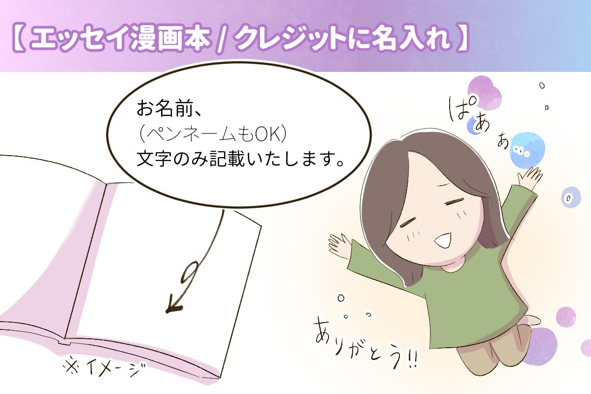 ※エッセイ漫画本のクレジットにお名前(ペンネーム可能)文字のみ、記載させていただきます。★載せて欲しいテーマも募集中!良いと思ったアイデアは採用させていただきます。