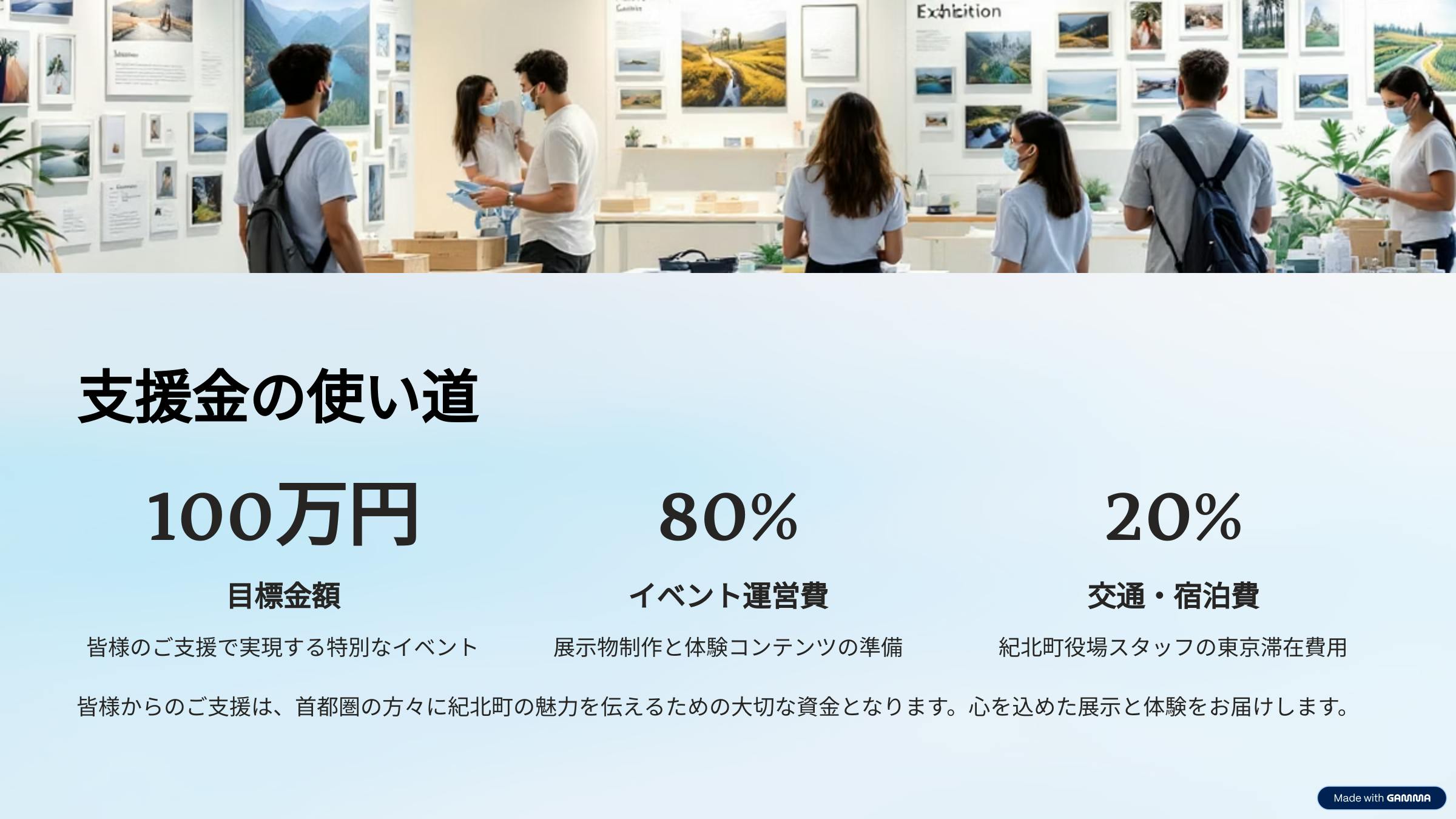 この最後の障壁を乗り越え、紀北町の未来を切り開くための一歩を踏み出すために、皆様のお力をお貸しください。皆様からのご支援は、展示物の制作費、会場設営費、広報活動費、そして何より地元の方々の声を直接届けるための移動費として、大切に活用させていただきます。