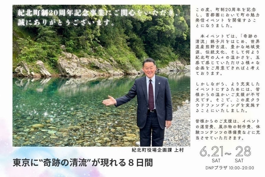 今回のプロジェクトが成功すれば、紀北町の町制20周年を記念し、NHKスペシャルでも紹介された奇跡の清流「銚子川」の神秘的な美しさを捉えたネイチャーフォトグラファー・内山りゅうさんの写真展を中心に、世界遺産の熊野古道、尾鷲ヒノキ、豊かな水産資源など、紀北町の宝を首都圏の皆様に直接体感していただける特別なイベントを開催します。