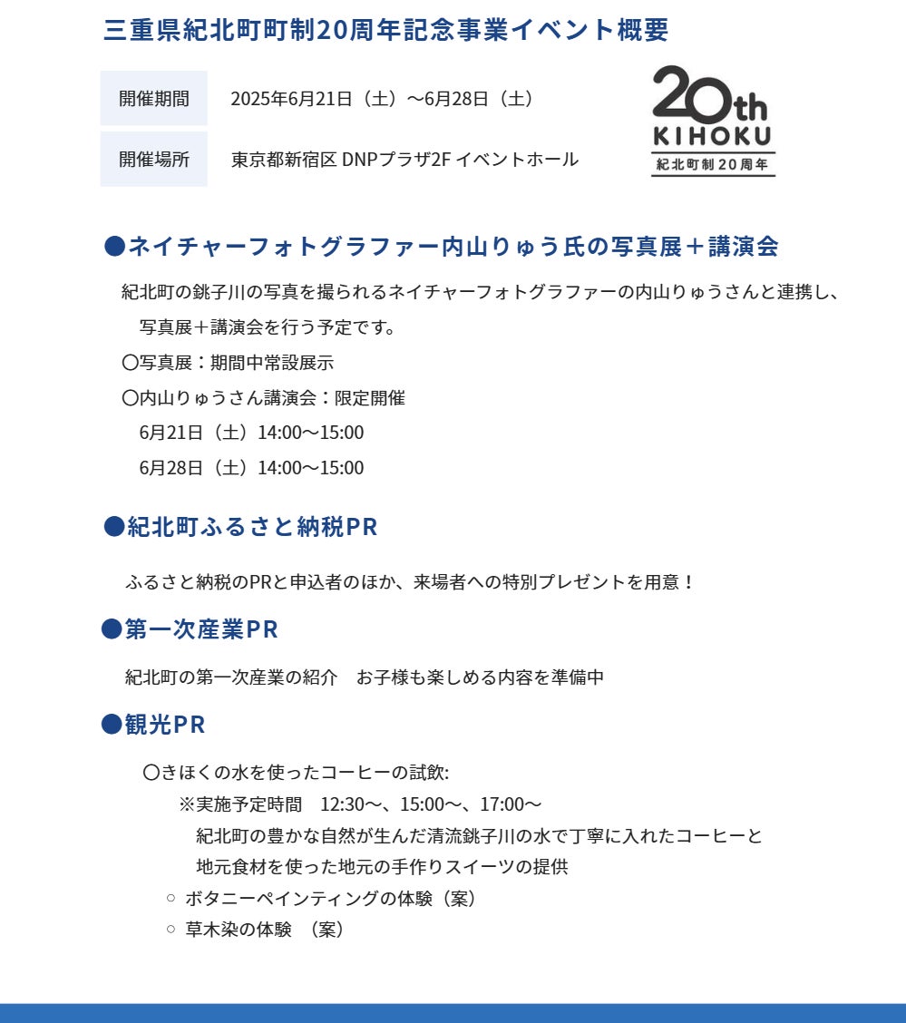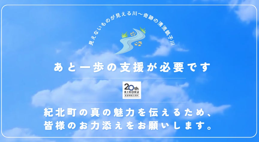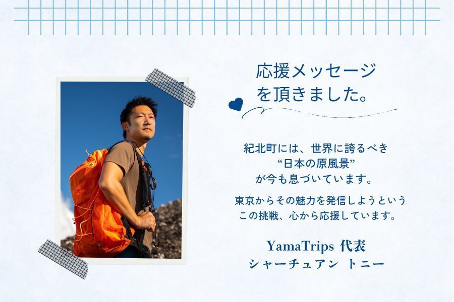 今回のプロジェクトが成功すれば、紀北町の町制20周年を記念し、NHKスペシャルでも紹介された奇跡の清流「銚子川」の神秘的な美しさを捉えたネイチャーフォトグラファー・内山りゅうさんの写真展を中心に、世界遺産の熊野古道、尾鷲ヒノキ、豊かな水産資源など、紀北町の宝を首都圏の皆様に直接体感していただける特別なイベントを開催します。