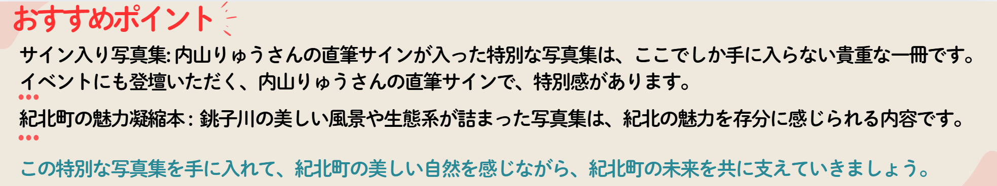 今回のプロジェクトが成功すれば、紀北町の町制20周年を記念し、NHKスペシャルでも紹介された奇跡の清流「銚子川」の神秘的な美しさを捉えたネイチャーフォトグラファー・内山りゅうさんの写真展を中心に、世界遺産の熊野古道、尾鷲ヒノキ、豊かな水産資源など、紀北町の宝を首都圏の皆様に直接体感していただける特別なイベントを開催します。