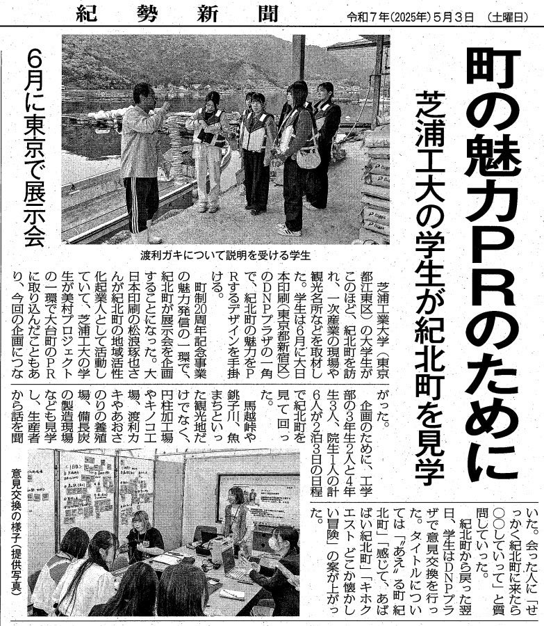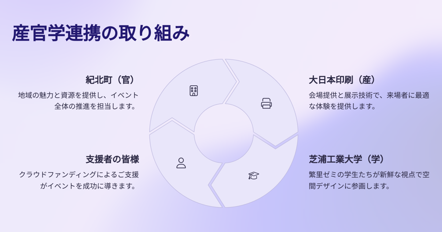 紀北町、企業だけでなく、芝浦工業大学デザインプロセス研究室の繁里ゼミの学生たちも加わった産官学連携として、学生たちの新鮮な視点と創造力を活かし、来場者の皆様により深く紀北町の魅力を体感していただける空間づくりに取り組んでいます。