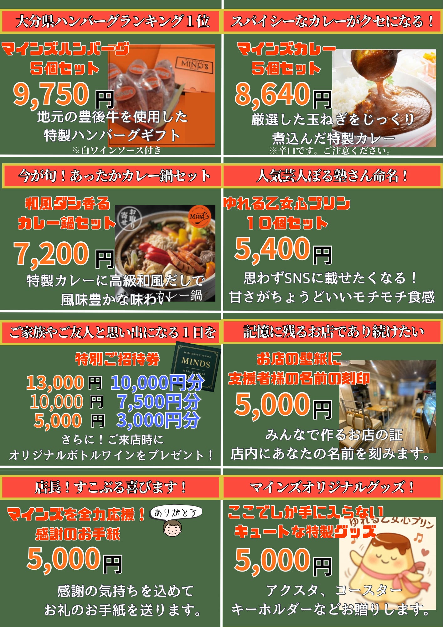 ご支援いただいた皆さまには、感謝の気持ちを込めて、さまざまなオリジナルリターンをご用意しています。お店自慢の味や限定グッズ、このプロジェクトならではの特典まで、バラエティ豊かなラインナップです!