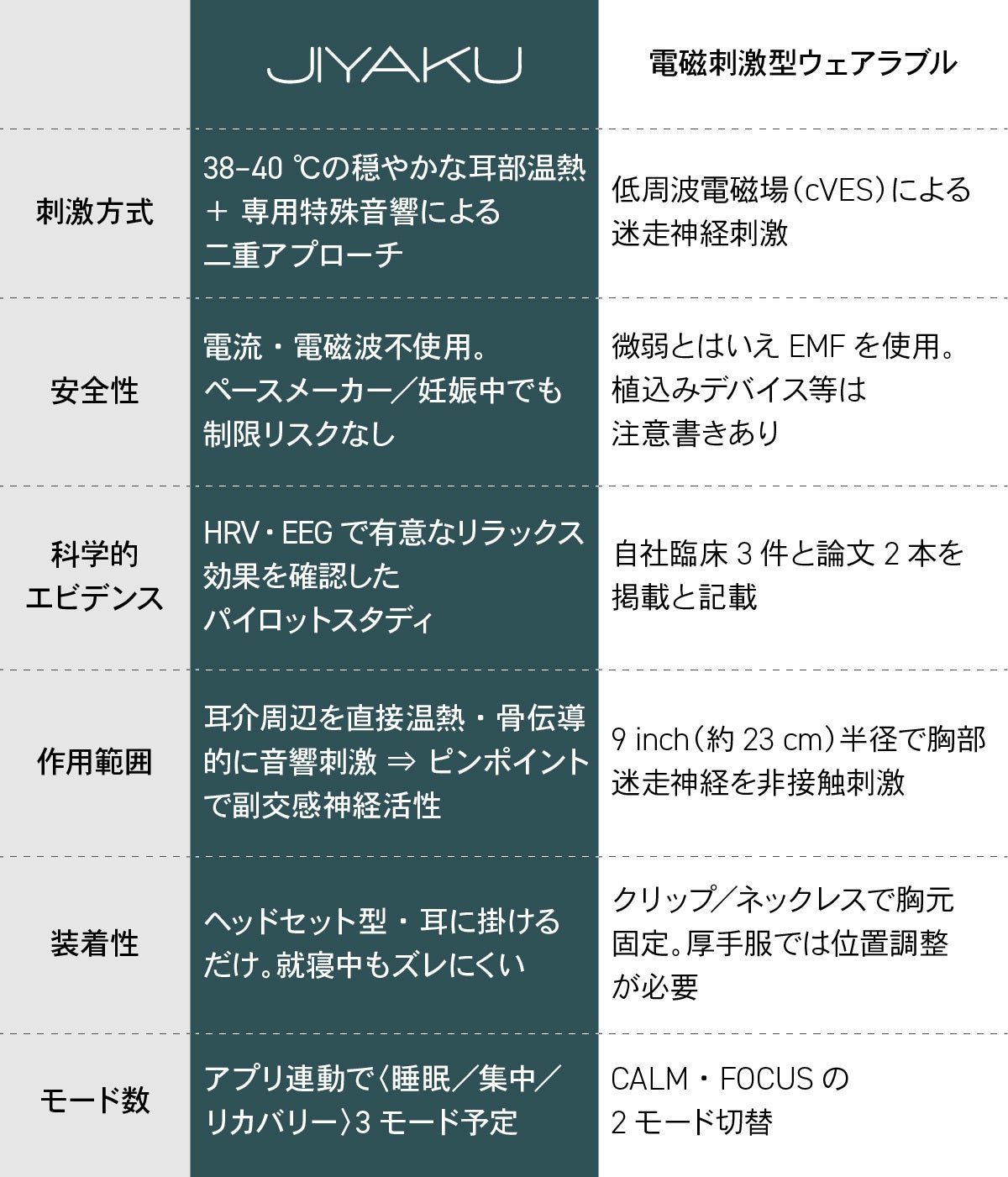 低周波電磁信号を用いた迷走神経刺激技術を活用している製品もその一つですが、JIYAKUは、全く異なるアプローチでリラックス効果と集中力向上を実現しています。