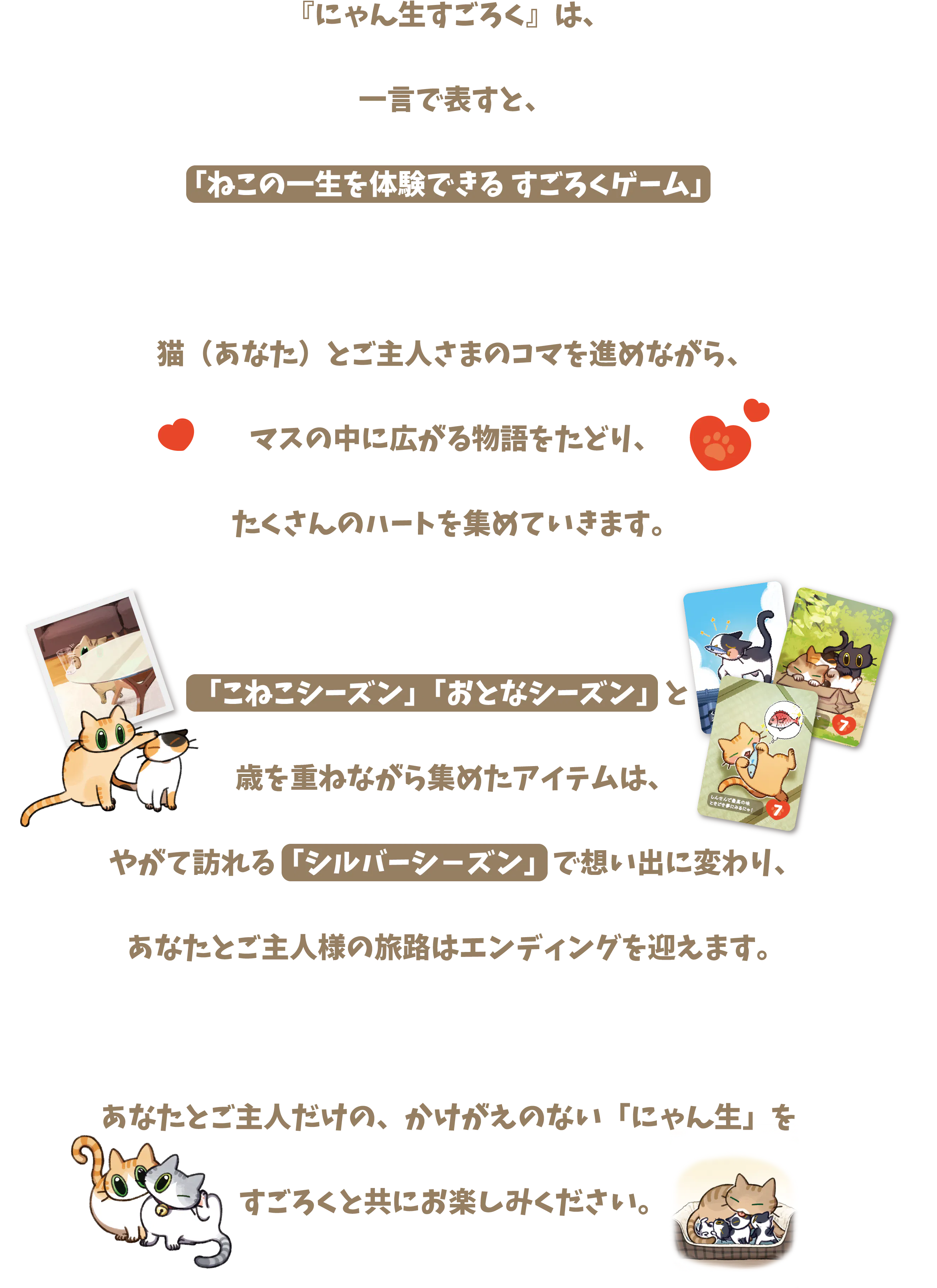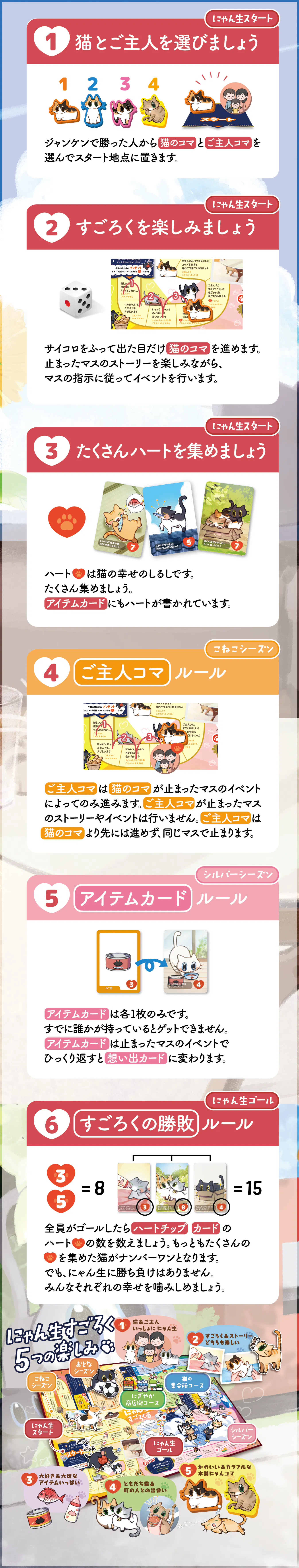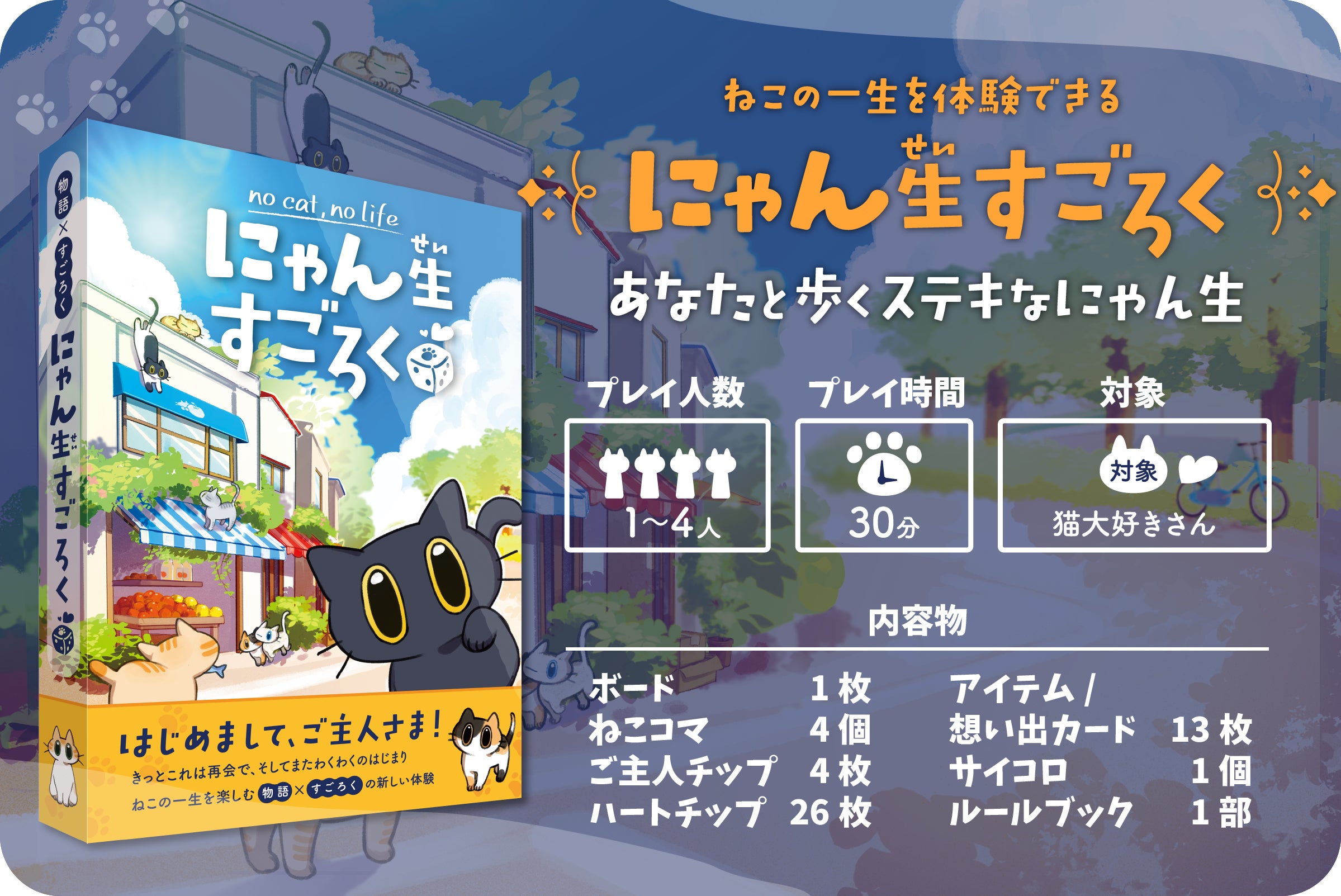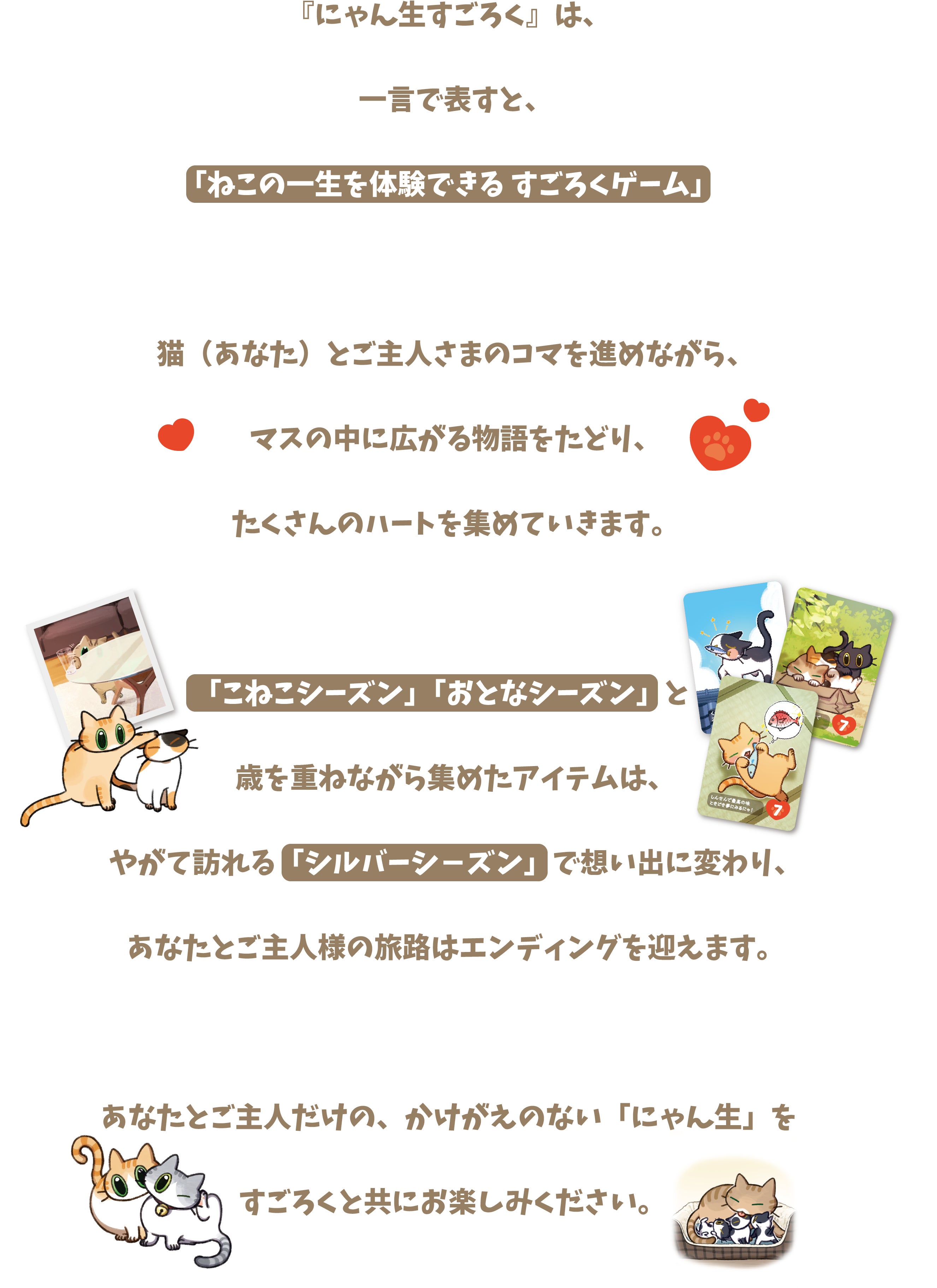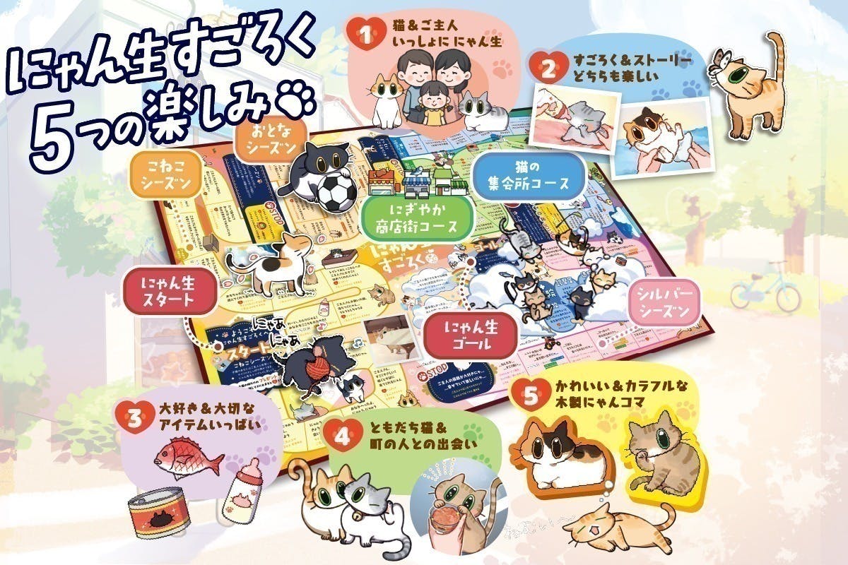 A. 基本はすごろくなので、どなたでも気軽にお楽しみいただけます。猫の物語をたどる感覚で、ゆったりと遊んでいただけます。
