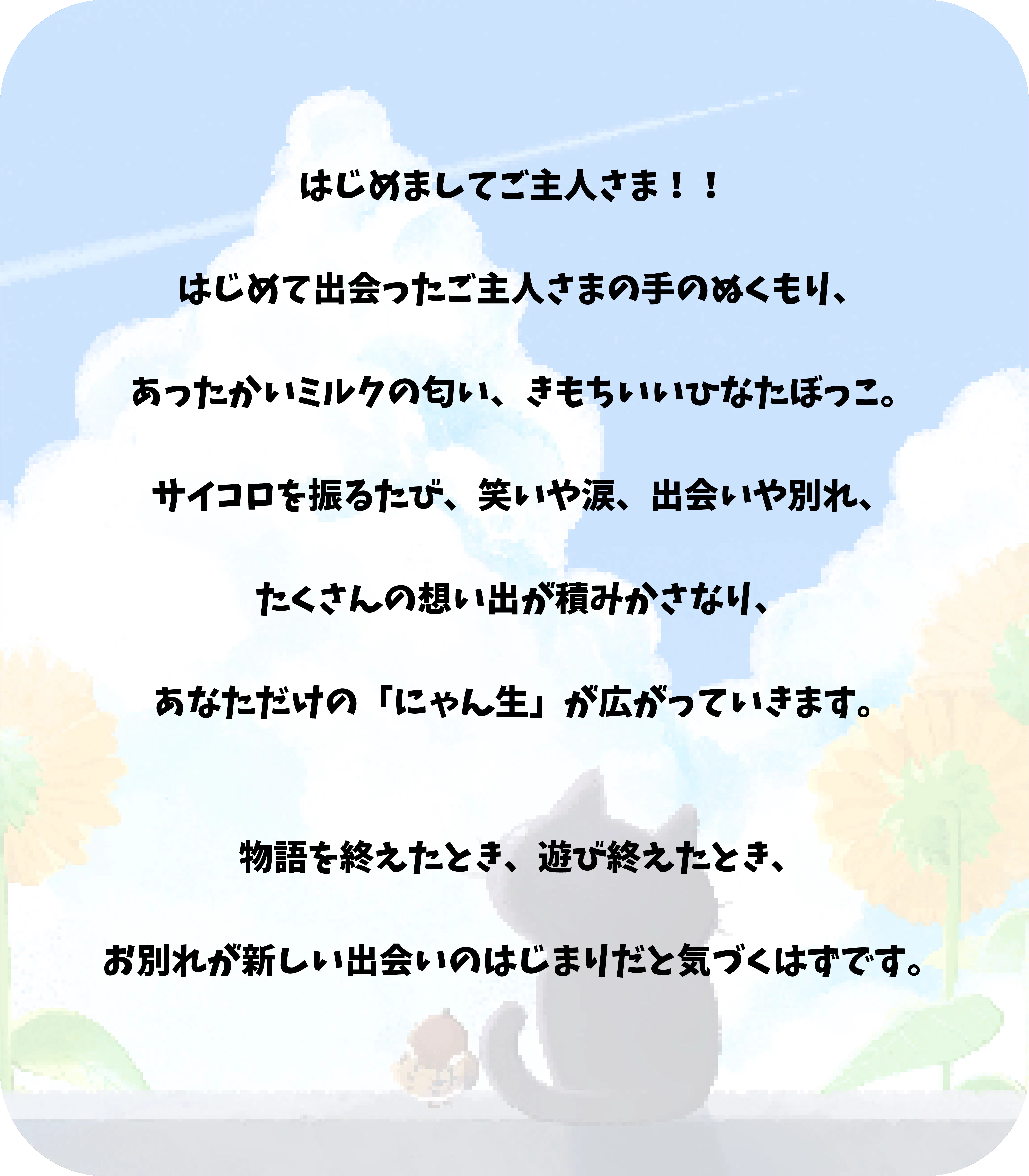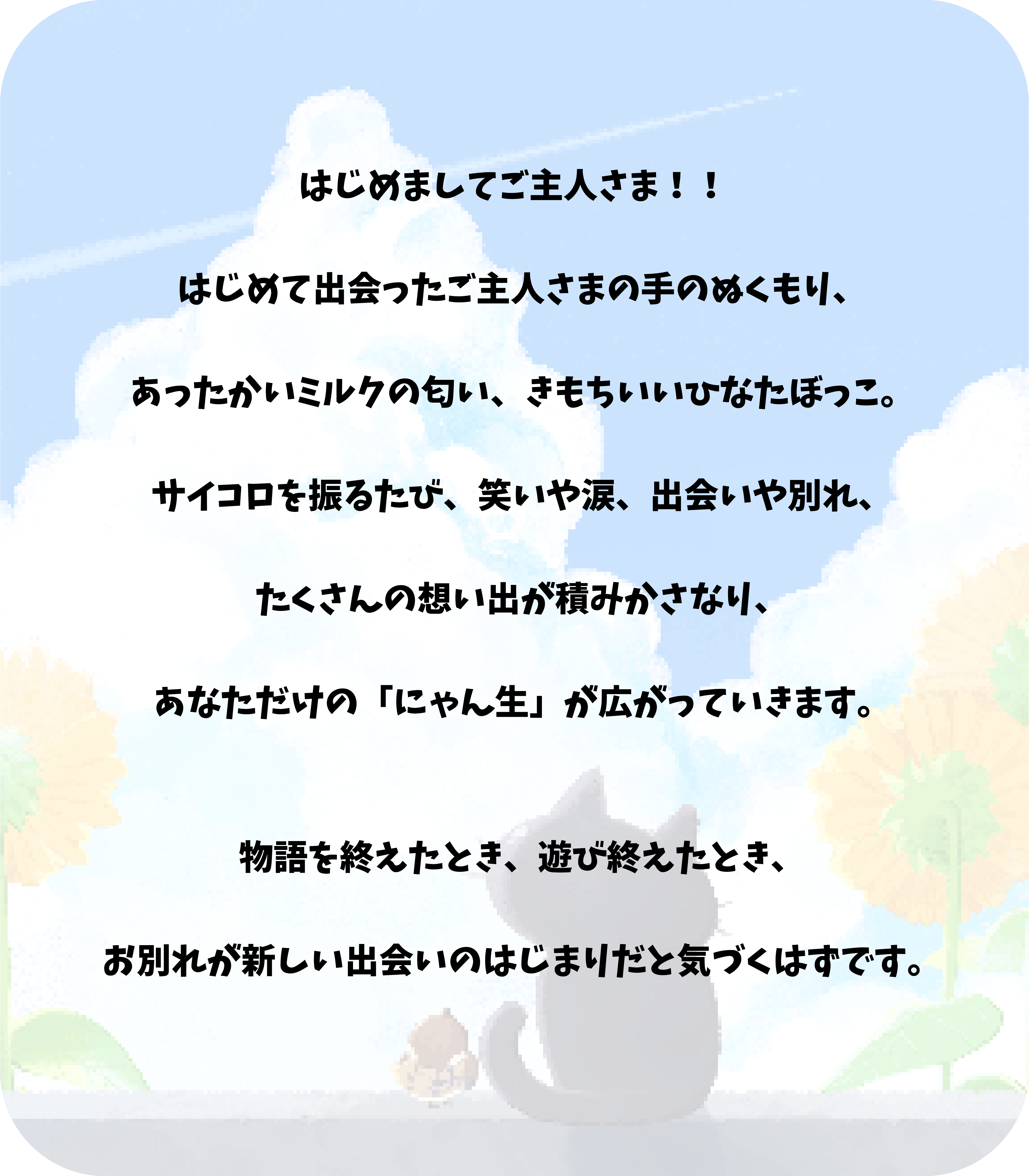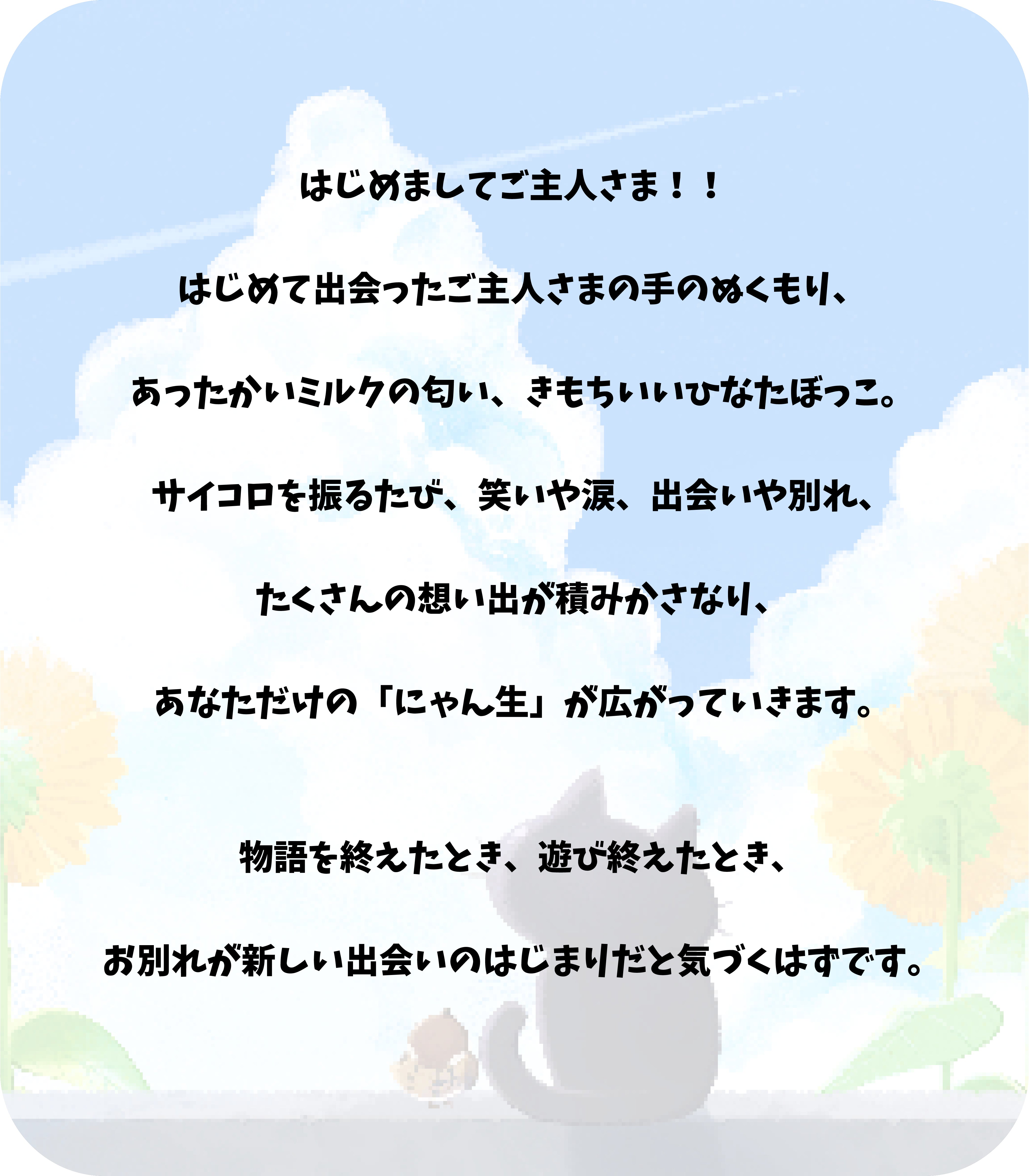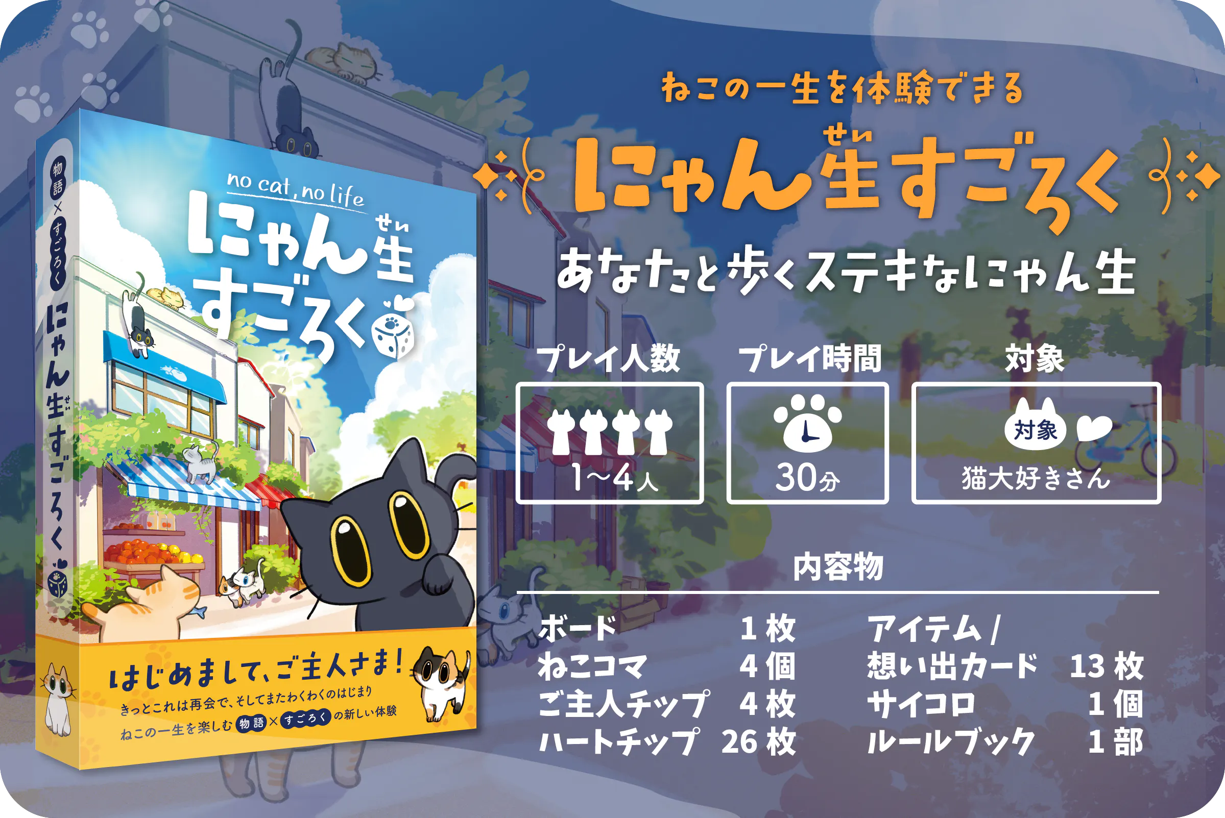 A. 基本はすごろくなので、どなたでも気軽にお楽しみいただけます。猫の物語をたどる感覚で、ゆったりと遊んでいただけます。