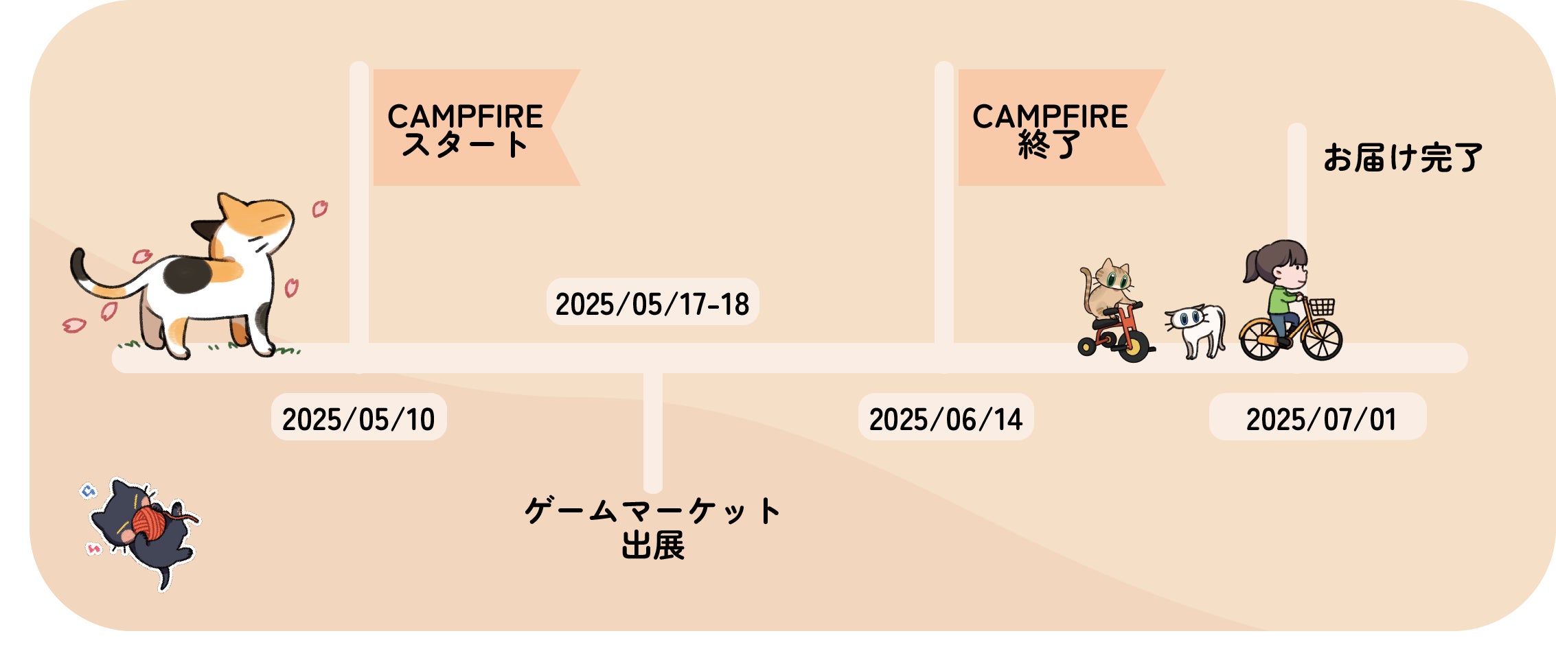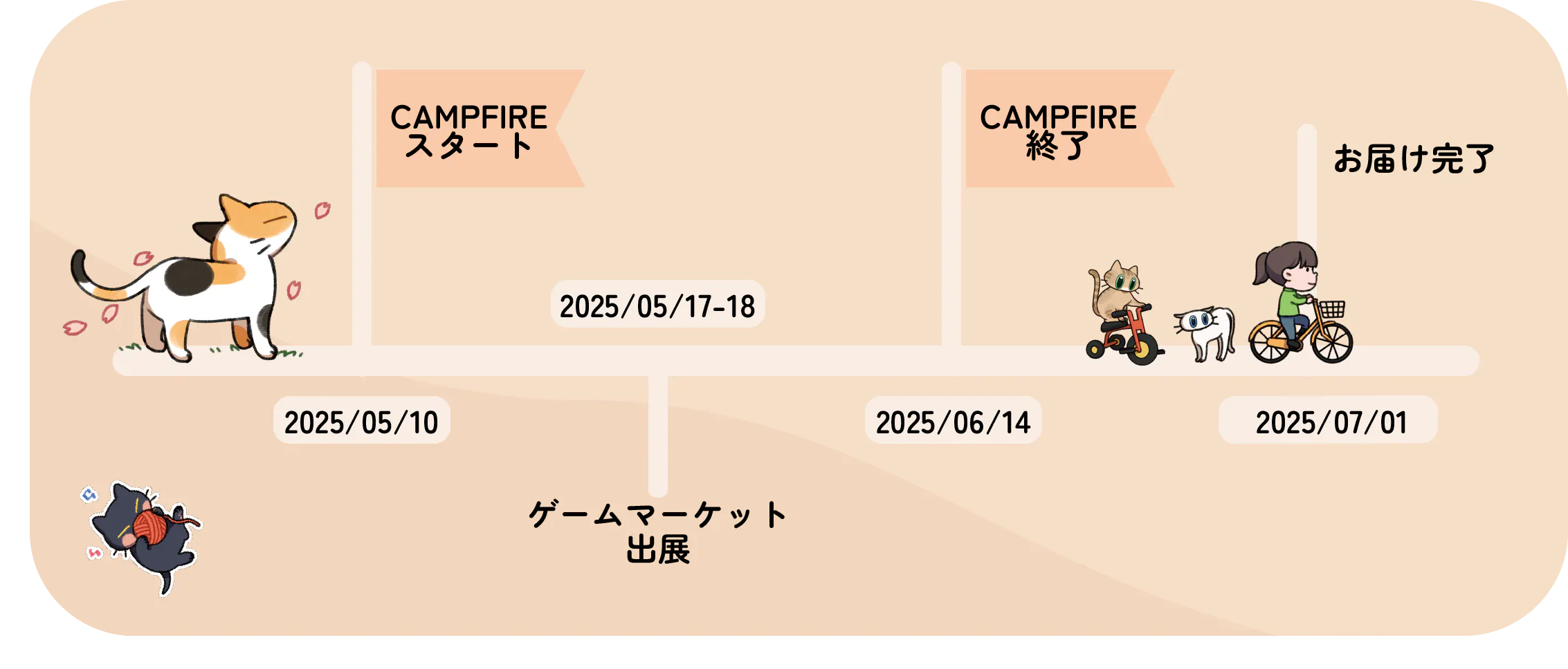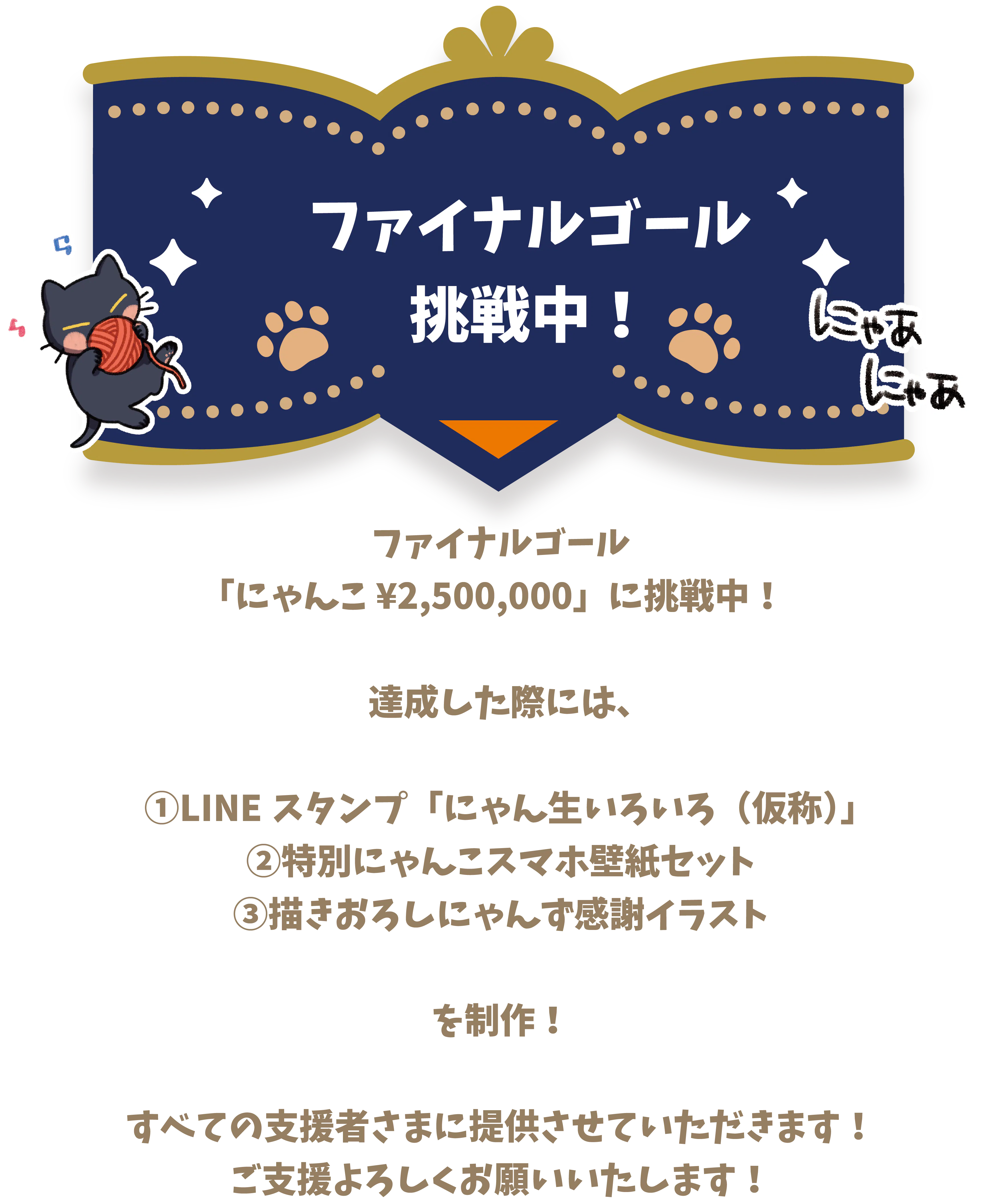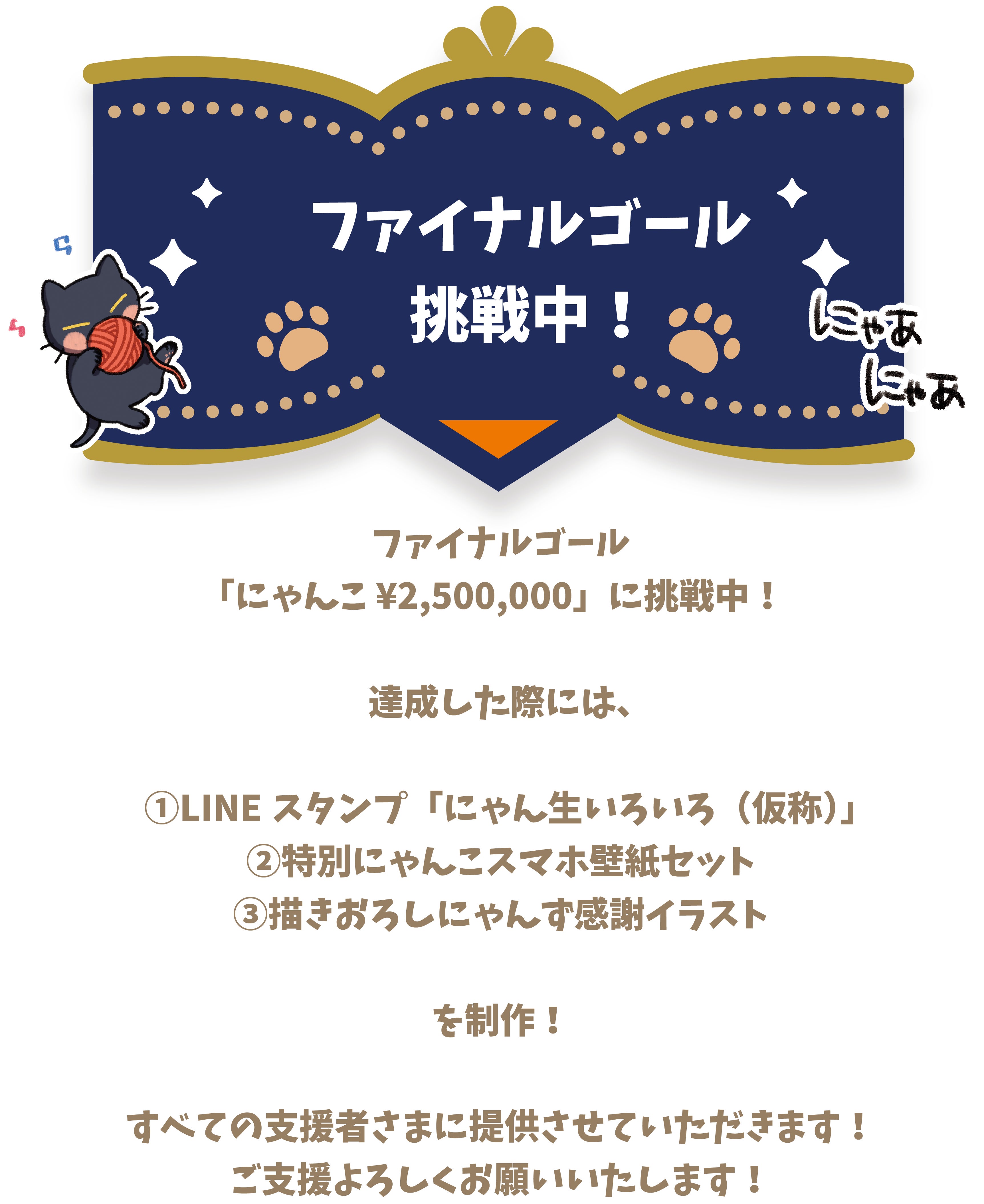 2025/06/15 01:14改めまして、『にゃん生すごろく』への多大なるご支援とあたたかい応援、本当にありがとうございました!ファイナルゴール達成を記念して!①LINEスタンプ「にゃん生いろいろ(仮称)②特別にゃんこ壁紙セット③描きおろしにゃんず感謝イラストを制作します!!現在、ゲームの発送と並行して制作中です。お届けは7月〜8月頃を予定しておりますので、夏の楽しみにお待ちいただけたら嬉しいです。ご支援いただいているリターンに含まれている壁紙につきましては6月中にメールにてご連絡いたします。 もっと見る