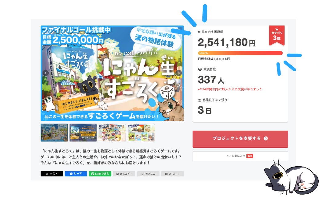 5月からはじまった『にゃん生すごろく』のクラウドファンディングは、たくさんのご支援と応援をいただき、本日すべて終了いたしました。本当にありがとうございました!SNSでの感想やお写真にも励まされています。最後のひとりに届くまで、丁寧に発送を続けてまいりますので、楽しみにお待ちください。そして、私たちひなたぼっこズの物語のはじまりに出会ってくださったのが、みなさんです。誇りに思っていただけるよう、これからも全力で取り組んでまいります。『にゃん生』の成長を、最初の仲間として温かく見守っていただけたら嬉しいです!かわいいにゃんこたちと共に、これからも頑張ります!本当にありがとうございました!ひなたぼっこズ