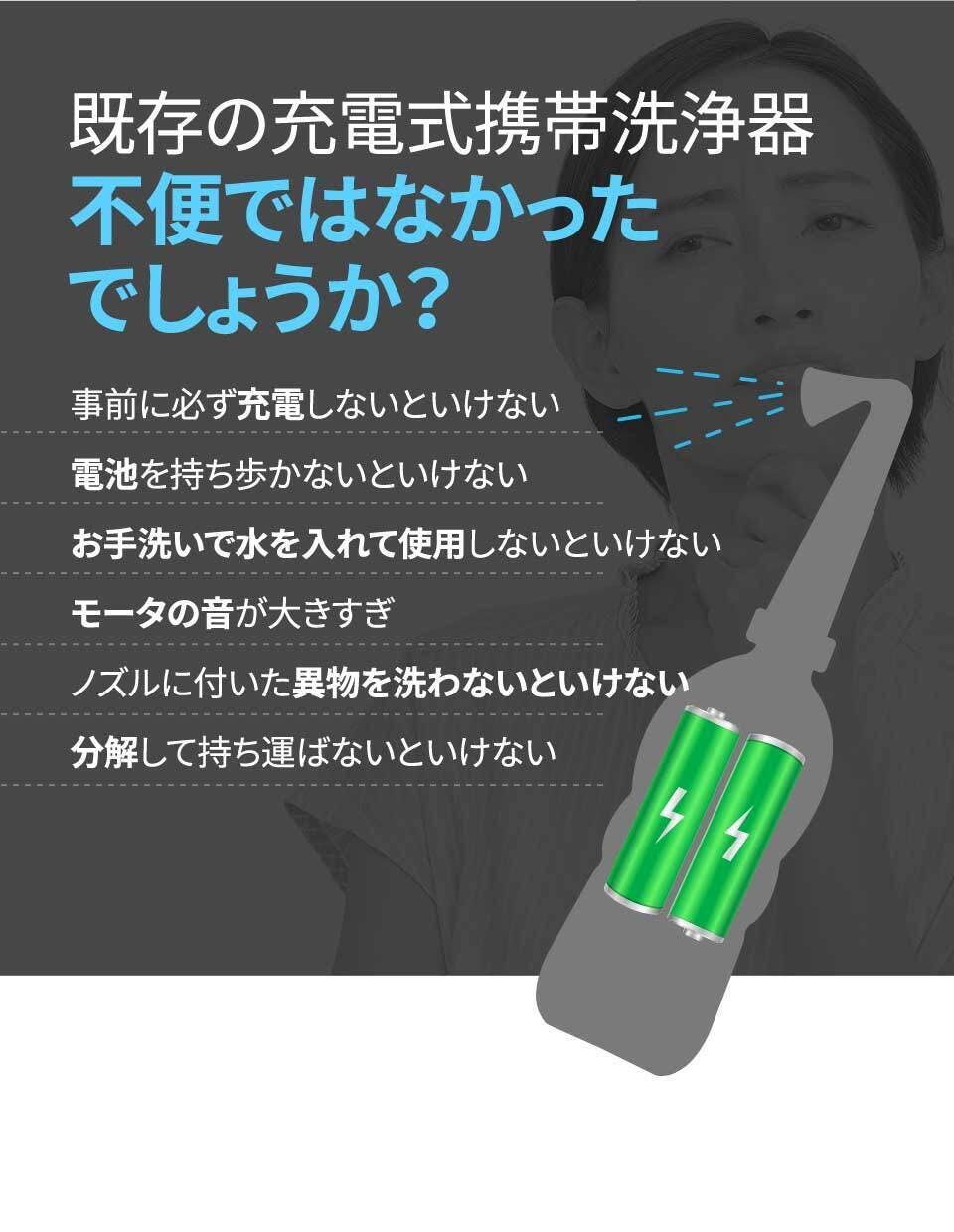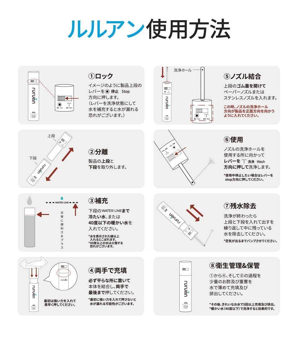 ノズル取り外し可能で衛生的!軽量でどこでも持ち運べる「ルルアン携帯洗浄器」 水を充填して使用するので電源も不要!充電も不要!手間なく使えるので便利です!