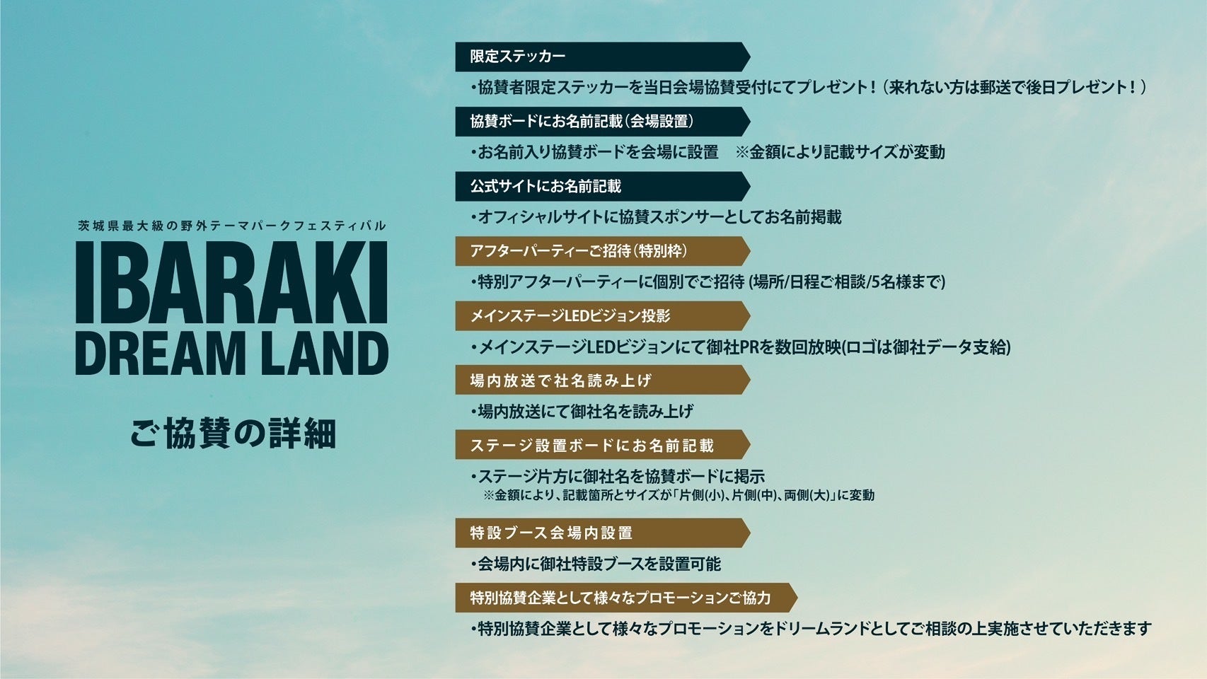 このCAMPFIREを通して新たな茨城県をこれから盛り上げたいと熱く想いのある仲間や企業様との出会いを期待しております。このIBARAKI DREAM LANDは毎年どんどんみんなで大きくしていきたいと考えております。一緒に盛り上げたい!応援したい!ボランティアでも参加したいなどの声も大歓迎です!