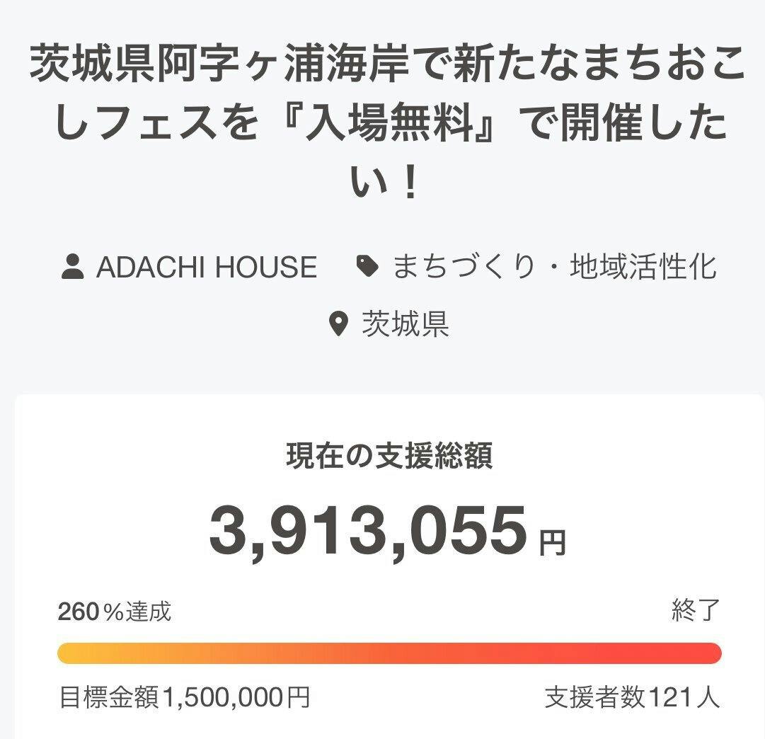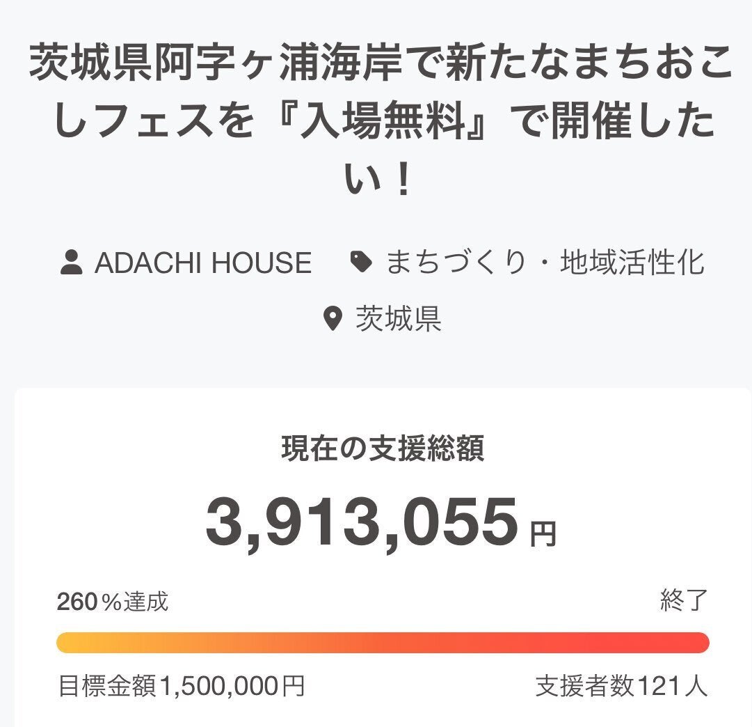 2025/05/14 19:00いつも温かいご声援誠にありがとうございます!実行委員長の安達勇人です。つい先日、クラウドファンディングが終了いたしました。本当に沢山のご支援、そして応援を心からありがとうございます。この船はいただいたご支援をしっかり大切に乗せながら6月7日(土)、8日(日)のイバラキドリームランド阿字ヶ浦開催に向けて向かいます。ドリームランドも人生と同じで何が起きるかわかりません。笑顔も、涙も、嬉しいことも、辛いこともリアルにこの活動報告には随時書いていきますね!一緒に作り上げる。それが僕のモットーでもあります。今回このイバラキドリームランドは関東最大のビーチマーケットフェスになります。新たな歴史を起こしていきましょう!取り急ぎ、本当に沢山の愛をありがとうございました!【クラファンsuccess達成!】約1ヶ月間開催されたIBARAKI DREAM LAND2025〜SEA〜in阿字ヶ浦海岸CAMP FIREクラウドファンディングですが、皆様の温かいご声援のおかげで約400万円(3,913,055円)のご支援が集まりました。本当に沢山のご支援誠にありがとうございます。心から感謝申し上げます。皆様からいただきましたご支援は大切に全額運営費として使わせていただきます!後日リターンについての案内のご連絡もさせていただきますのでしばらくお待ちください!当日会場にて公式グッズ物販やドリームランド応援ビアガーデンなどもいたします!売上は全て共に運営費に全額寄付されますので楽しみながらご協力よろしくお願いします!IBARAKI DREAM LAND実行委員会一同 もっと見る