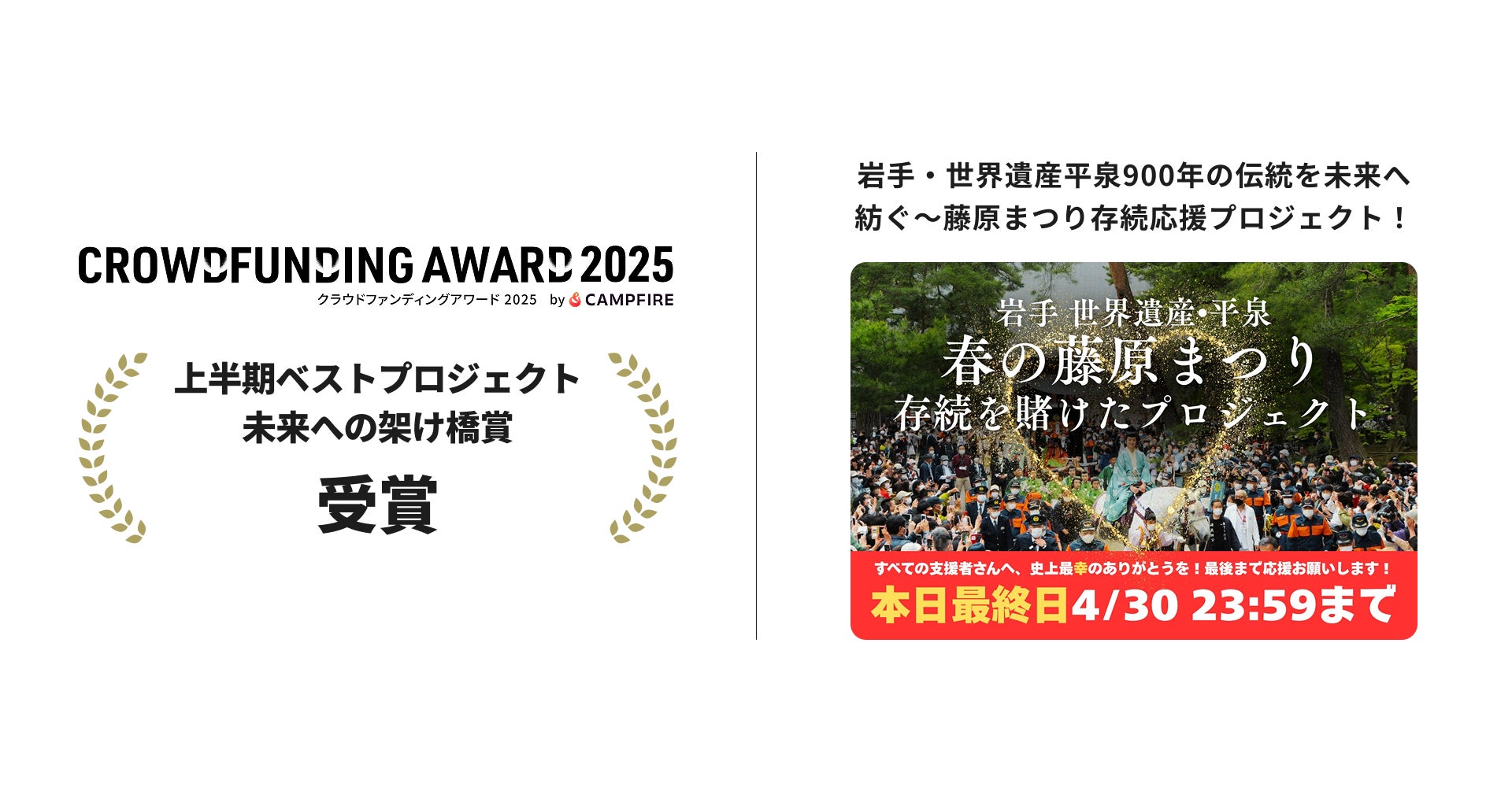 【上半期ベストプロジェクト・地域拠点部門・未来への架け橋賞】を受賞しました!支援して頂いた皆さんのおかげです。皆さんとの交流によって、このプロジェクトはカタチが作られていきました。途中から、僕の意識まで変わっていったことを今でもよく覚えています。プロジェエクトが終わった時に感じたのは、「目標を達成できた」ではなく「何かが完成した」でした。プロジェクトページ本文のラストに『平泉と藤原まつりを応援してくださる方々と一緒にチカラを合わせて、未来を創り変えることができたら、こんなに素敵なことはありません』と記していました。正直、この時は多少カッコつけていたと思います。でも本当に、未来を創り変えようと動き出したんです。二次交通が弱い平泉観光の長年の懸案であったレンタサイクル事業が始まりました。楽天市場には全国43番目の平泉町公式アンテナショップがオープンしました。確かに、未来への架け橋は僕たちの心に架かったのです。だから、この活動報告で皆さんに一番最初にお伝えしたかった。これからは、皆さんと一緒に架けたこの橋から、何を未来に届けることが出来るか?これからも未来に対して誠実に、失敗なんか恐れずに挑戦を続けていきます。見守って貰えたら嬉しいです。今年も残りわずかです。熊がまだ冬眠していないのも気になるところですが…いま平泉観光協会で、来年の義経公役の選定が行われています。いよいよ春の藤原まつり2026が動き出します。