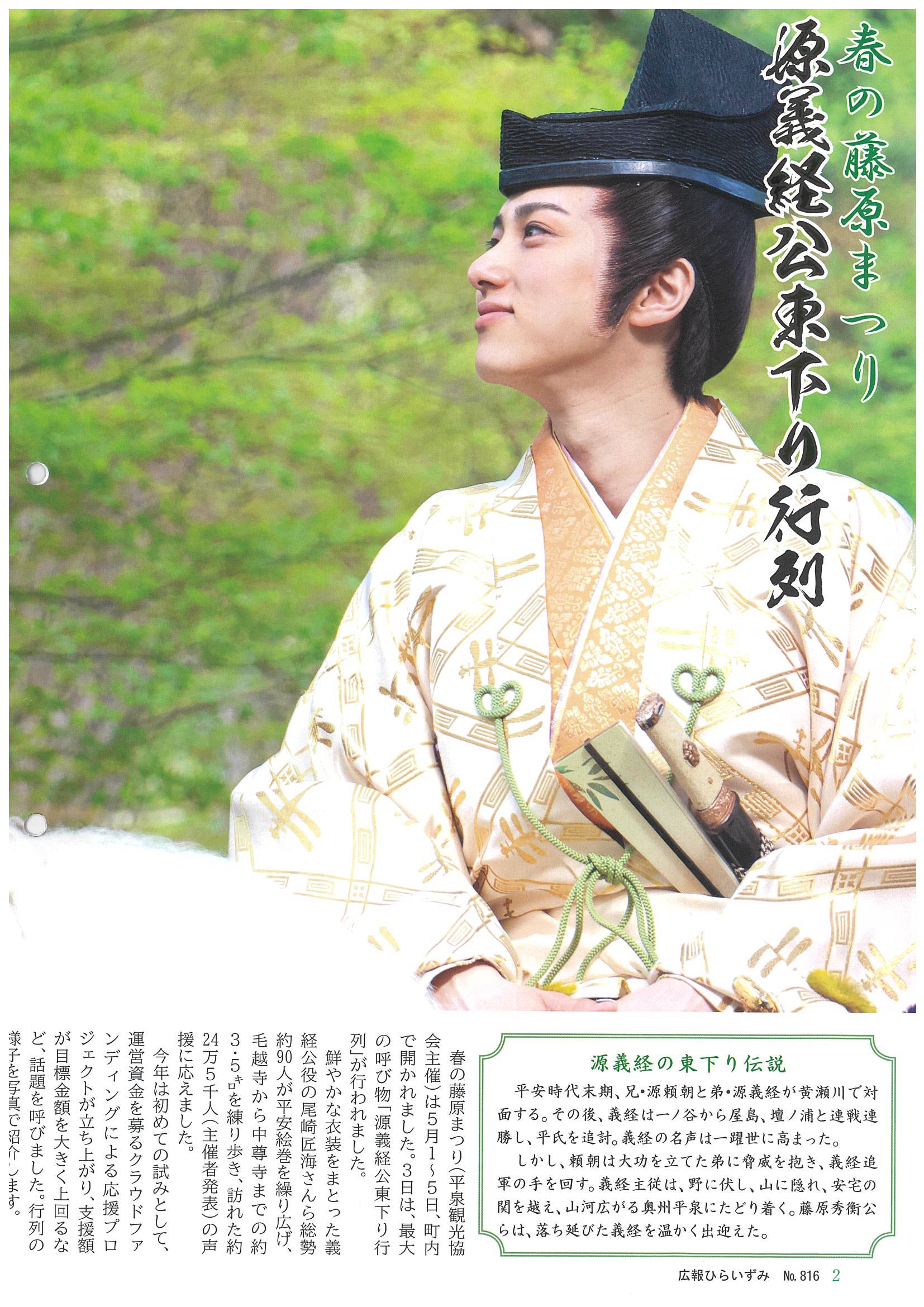 藤原まつりから1ヶ月近く過ぎ、落ち着きを取り戻しています。僕も、観光協会も、平泉町も。祭りのあとの寂しい感じも、ありがたい事に日々のゴタゴタが忘れさせてくれます 笑今も普段の何気ない会話の中に、尾崎匠海さんのこと、伊藤健太郎さんのこと、クラファンのことが話題にあがります。何より藤原まつりの未来の話をする人が増えました。目的は果たせた、挑戦して良かったと改めて実感している今日この頃です。(画像は、今月の平泉町の広報誌です)本日、平泉町を代表して主催者である平泉観光協会名で、皆さまに御礼メールを送らせて頂きました。※一部、リターンに「お礼状」とある方々には、後日あらためて封書でお届けしますのでお待ちください。ここから余談。昨日ハマダ歌謡祭に匠海くん出てましたね。JUJU歌ってましたね。あの日以来、僕ら平泉町民は匠海くんが気になって仕方ないんですよね。しかも芸能界のドン・浜ちゃん復活SPのタイミングにキャスティングされるなんて、持ってます!もちろん健太郎くんのドラマもしっかり観てますよー。