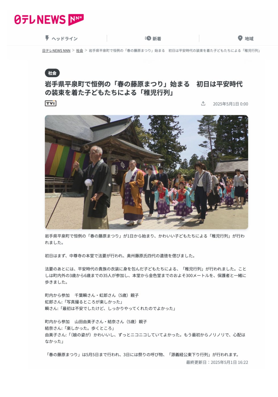 2025年の源義経公東下り行列が無事に終わりましたー!いやー、すごい人、人、人でした。天気も良く、大きな事故も起こらず、とっても良い東下りだったと思います。何よりINIと尾崎匠海さんのファンの方がのマナーが素晴らしくて感心しましたし、運営の立場として本当にありがたかったです。そして尾崎匠海・義経公の衣装ですが、これは「勝ち虫」と言う柄だそうです。恥ずかしながら知らなかったので、Googleで調べました。『勝ち虫とは、トンボの別名で、不退転の精神や勝利を呼ぶ縁起の良い虫として、武士に好まれた模様です。トンボは前にしか飛べないことから、そのイメージが縁起物として使われたと考えられます。』とのこと。近くで見ると、ほらトンボ柄。かわいいですよね。そして全体コーデのアクセントにオレンジを使ったところがニクいです。さすが井筒企画さん。これには尾崎さん本人も「嬉しい」と言ってました。と言うことで、本日の流れを画像でざっくりと。世界遺産•毛越寺にて、秀衡公(尾崎くんの右隣)にあたたかく出迎えられた「ねぎらいの場」を再現し、毛越寺庭園の池「大泉が池」で船に乗り(なぜ?とは聞かないでください)颯爽と馬に乗り、いよいよ東下り毛越寺を出て町中へ、同じく世界遺産・中尊寺まで約4kmを進みます途中、沿道に詰めかけた大勢のファンの方々の声援を受けながら中尊寺に到着最後にファンの皆さんへ感謝!でfinish!尾崎匠海さん、お疲れ様でした。ファンの皆様、お疲れ様でした。主催者である観光協会、東下り保存会の方々、お疲れ様でした。町役場の職員も総出で頑張っていましたし、消防隊員をこれだけ見ることは無いくらい要所をガッチリ抑えてくれていました。皆さん本当にお疲れ様でした。夢のような1日でした。ありがとうございました!今日のところは速報と言うことで。撮った写真はまだありますし、明日以降に続報として報告します。また、インスタ @sekahira.infoに今日の動画をストーリーズにアップしています。24時間過ぎてもハイライト「クラファン2025」に保存してますので、是非ご覧ください。
