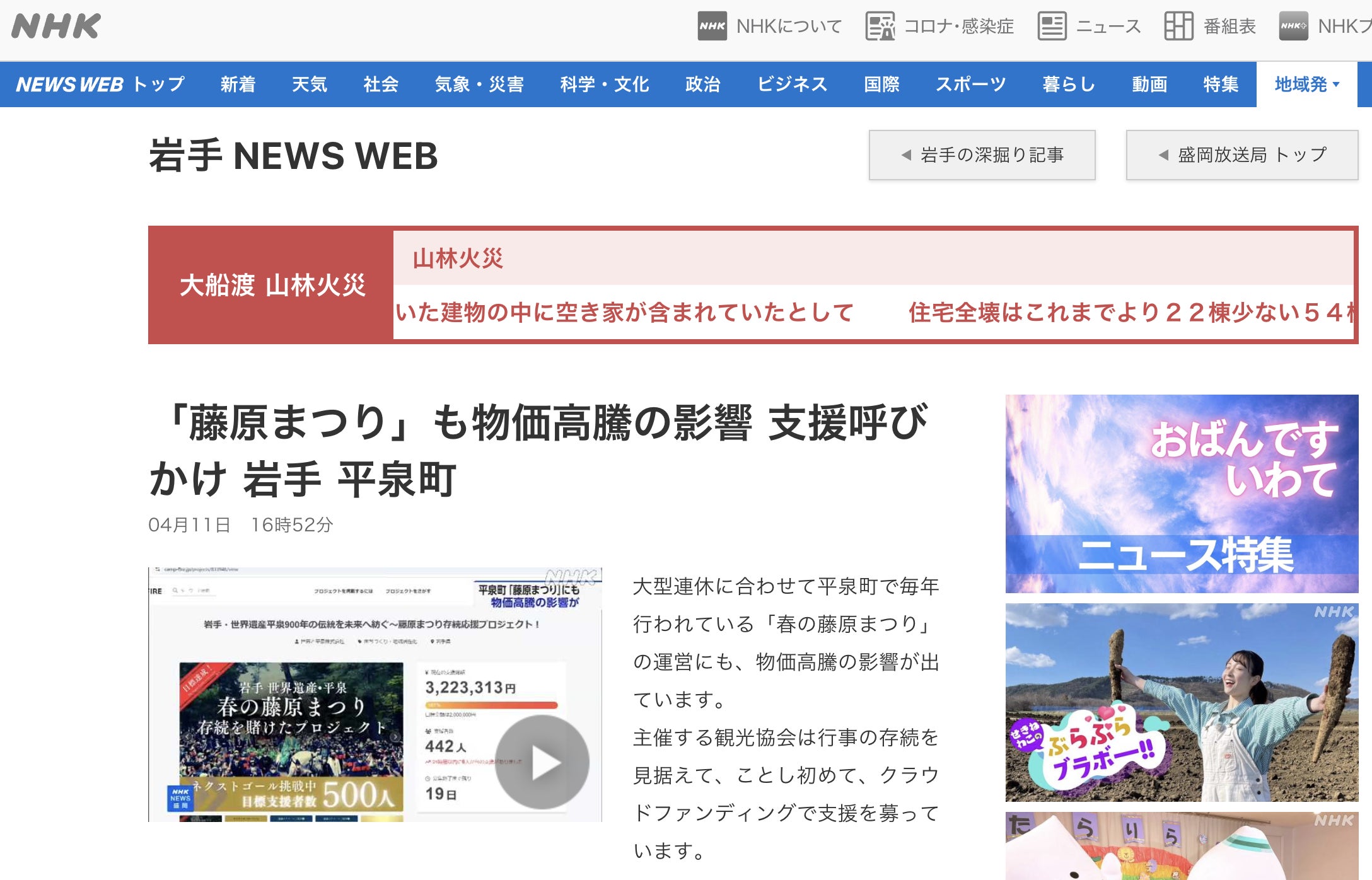 NHK岩手放送局の夕方のニュース番組「おばんです いわて」で、当クラウドファンディングのことを取り上げて頂きました。ありがとうございました!