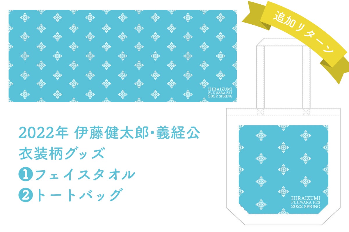 お待たせして申し訳ございません!伊藤健太郎ファンの皆様からの熱い要望にお応えして、2022年伊藤健太郎・義経公の衣装柄グッズを追加リターンとしてご提供します。コロナ禍という長くて辛い日々を経て3年ぶりの開催となった2022年の東下りは、強く印象に残る日となりました。そんな消えない想い出を、大切に紡ぎ続けてくれている熱いファンの皆様からの要望にお応えして追加リターンを決定しました。2022年の熱狂再び!です。綺麗な絵柄を最大限に活かせるフェイスタオルと、それを持ち運べるトートバッグの2種類。支援額は同じです。包まれるか?一緒にお出掛けするか?貴方はどっちにしますか!?尚、伊藤健太郎さんご本人と事務所にご迷惑が掛からないようにハッキリ明記しますが、これらのグッズはご本人とは関係ありませんので予めご了承ください。2022年のあの日、義経公に成られた伊藤健太郎さんが着た衣装を、京都の井筒企画さんから許可をいただき、グッズとして製作するものです。
