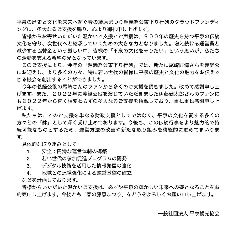 支援者さんの数が600を超えました。本当にありがとうございます。祭りまで半月を切り、主催者として多忙極まる中で、平泉観光協会として、どうしても皆様に感謝の気持ちをお伝えしたいと文章にしたためたものです。原文のまま掲載しています。文中にもありますが、支援していただく皆さまとの「絆」が、たぶん唯一と言っていい私たち関係者にとっての励みです。「数は力なり!」本当にその通りだと思います。私たちの挑戦はまだまだ続いています。ラストスパート精一杯頑張ります。引き続き応援よろしくお願いします!