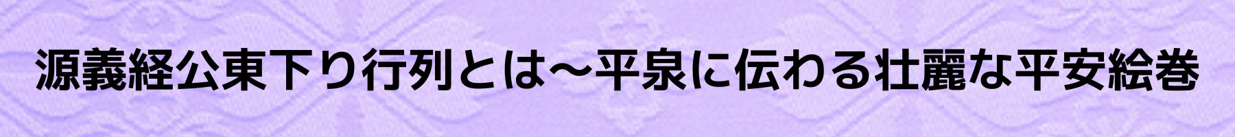 義経公東下り行列は、義経主従が兄である源頼朝の追討から逃れて平泉に辿り着いた時、藤原秀衡公や地元民に歓迎された故事に倣ったもので、毛越寺から中尊寺までを総勢91名の行列によって壮観な平安絵巻を再現します。