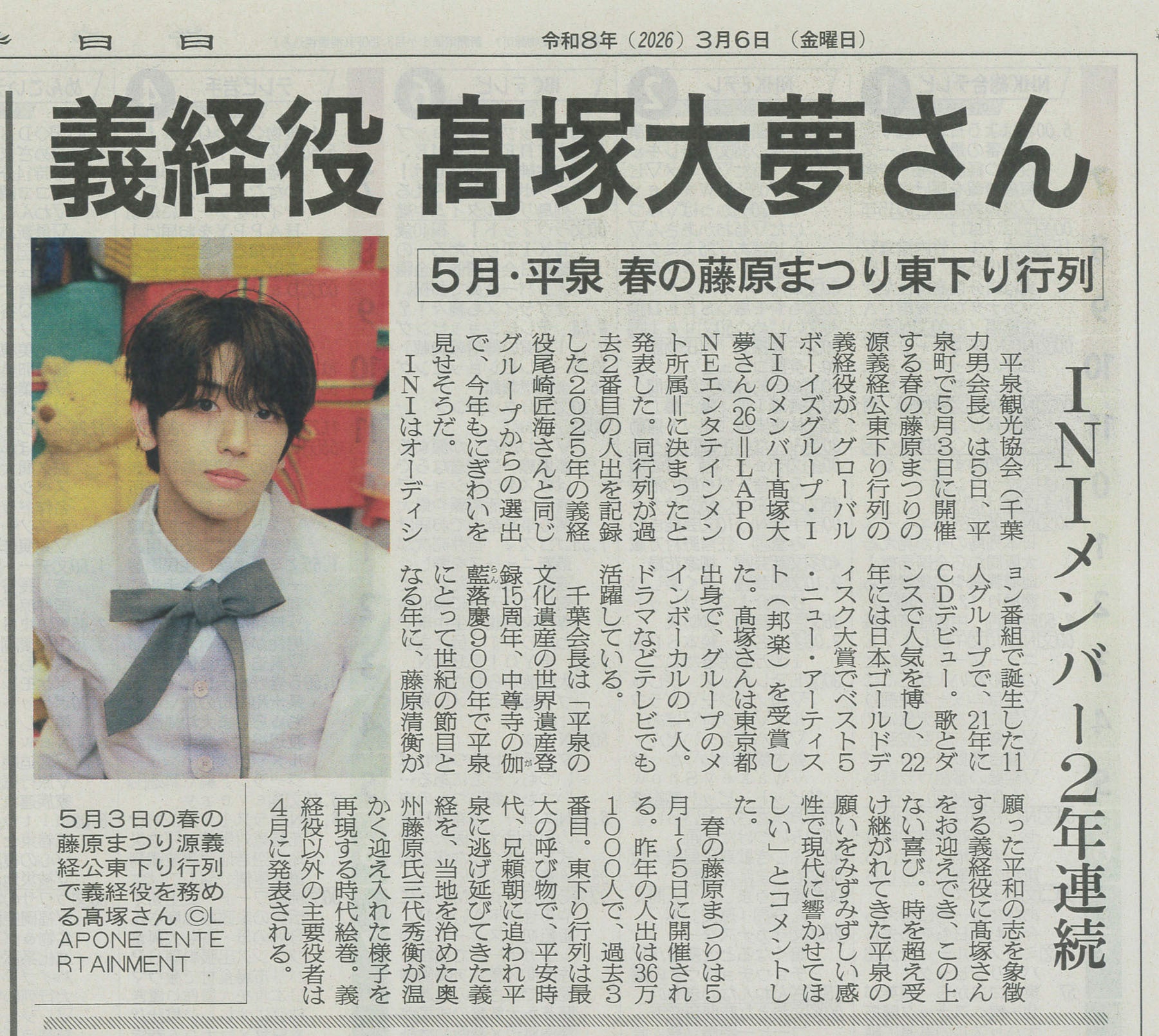 2026/03/06 21:19今日6日の朝刊。岩手日日新聞、と言います。平泉や、大谷翔平くんの故郷・奥州市水沢など、岩手の県南エリアだけで発行している新聞です。もはや広域な広報誌という趣きもあり。ローカル、というか、ディープという方がピッタリかも知れません。僕らは当然、いつも記事を書いてもらっているので、感謝感謝です。さて、なにしろ我が藤原まつりは、主役の義経公が決まらないと、何も始まりません。でも、義経公が決まれば、すべてが動き出す。関係者達が、各々の役割で一斉に動き出す「祭りが始まった音」が、町中から聞こえるようです。もちろん比喩です。でも本当に、そんな感じがするんです。実質的な意味では、今日が藤原まつりのスタート、と言えるでしょう。さあ、始まります。髙塚大夢・義経、降臨まで、2ヶ月を切りました!【プロジェクト開始の3月20日12時まで】検討中のリターン品の進捗や、祭りの最前線の最新情報など、お伝えしたいことが沢山あります。今後も、この昨年のプロジェクトページから、「活動報告」で、情報を更新していきます。(今年のプロジェクトページは、本公開するまで活動報告が使えないそうなんです)ぜひ新旧2つのプロジェクトの「お気に入り」登録お願いします! もっと見る