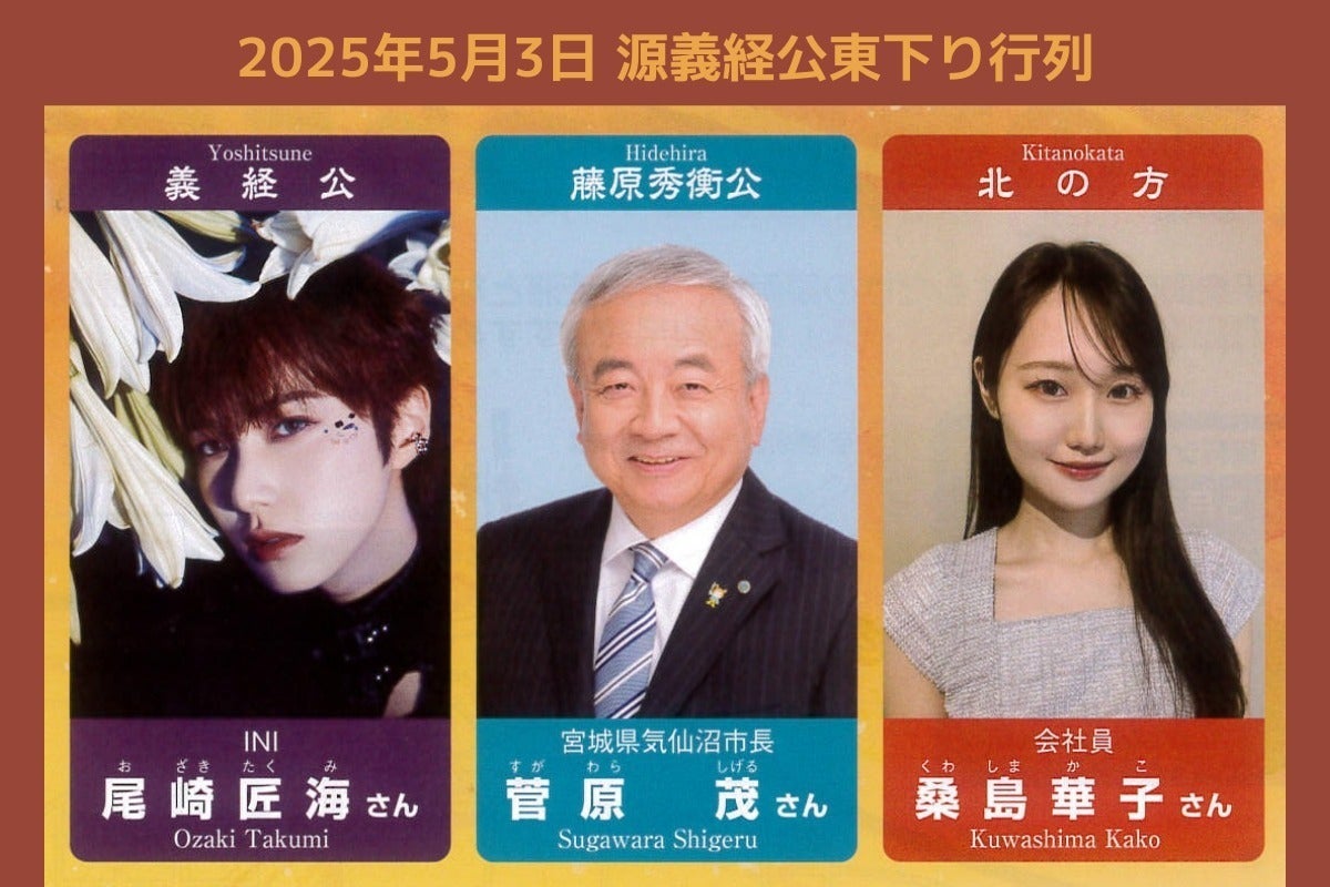 一行は地元の名士などが務めますが、義経公役は1973年から俳優やタレント等の若い男性芸能人が務めており、東下り行列の知名度と人気が飛躍的に高まりました。特に2005年には当時放送中のNHK大河ドラマ『義経』で主演を務めていた滝沢秀明さんが参加したことが大きな話題となり、過去最高の観光客が訪れました。