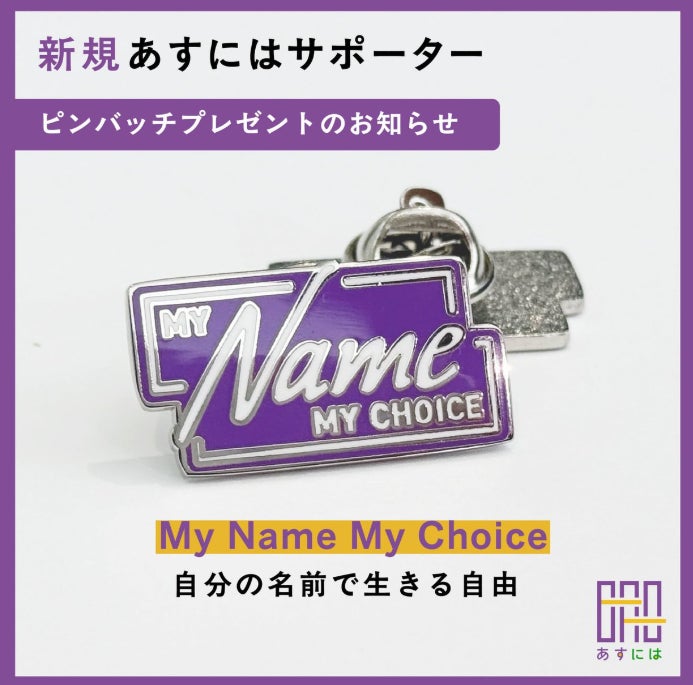 3月31日まで、新規サポーター登録もしくはサポート口数の追加をしてくださった方に、My Name My Choice ピンバッチをプレゼント!