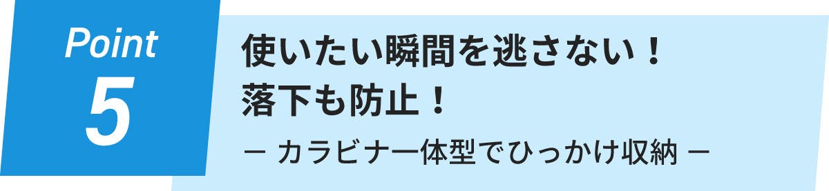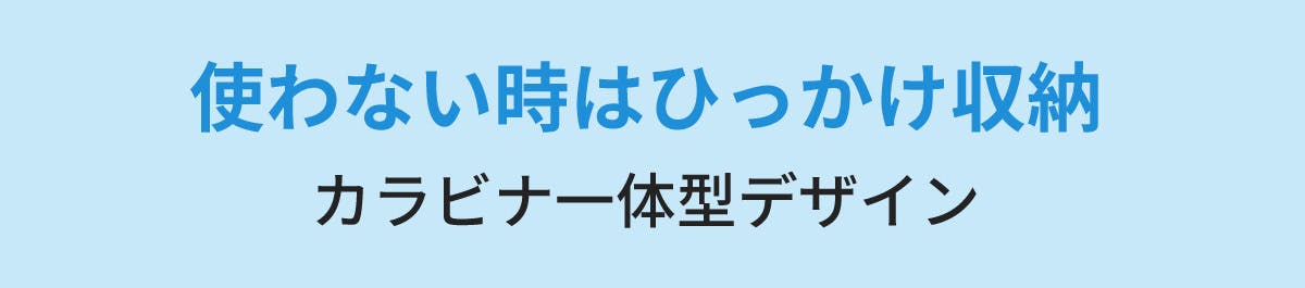本体デザインに自然になじむカラビナ一体型仕様などので、バッグやリュック、ベルトループ、ストラップに引っ掛けるなど、使うシーンに合わせて“置き場所”を選びません。