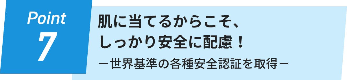 また、肌に当てて使用するものだからこそ、ヨーロッパのRoHS(有害物質の制限)やCE(安全・健康・環境基準の適合)、アメリカのFCC(電磁波干渉の管理)といった電気・電子機器の各種安全認証を取得しています。