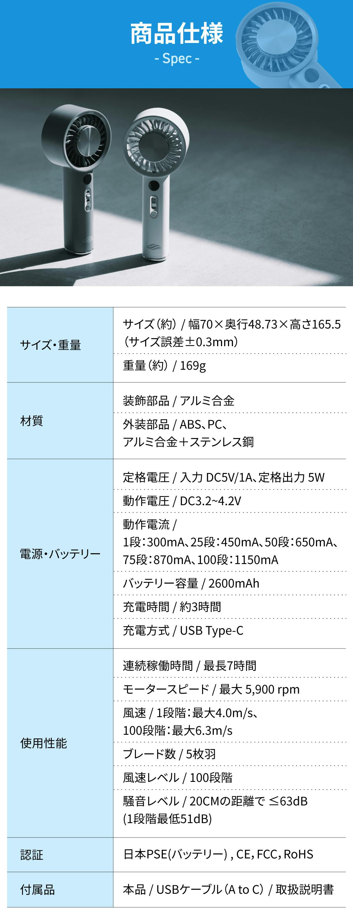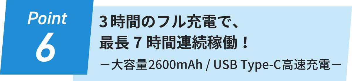 約3時間の充電で、最長7時間(※最小風量時)の連続使用が可能な、2600mAhの大容量バッテリーを採用。
