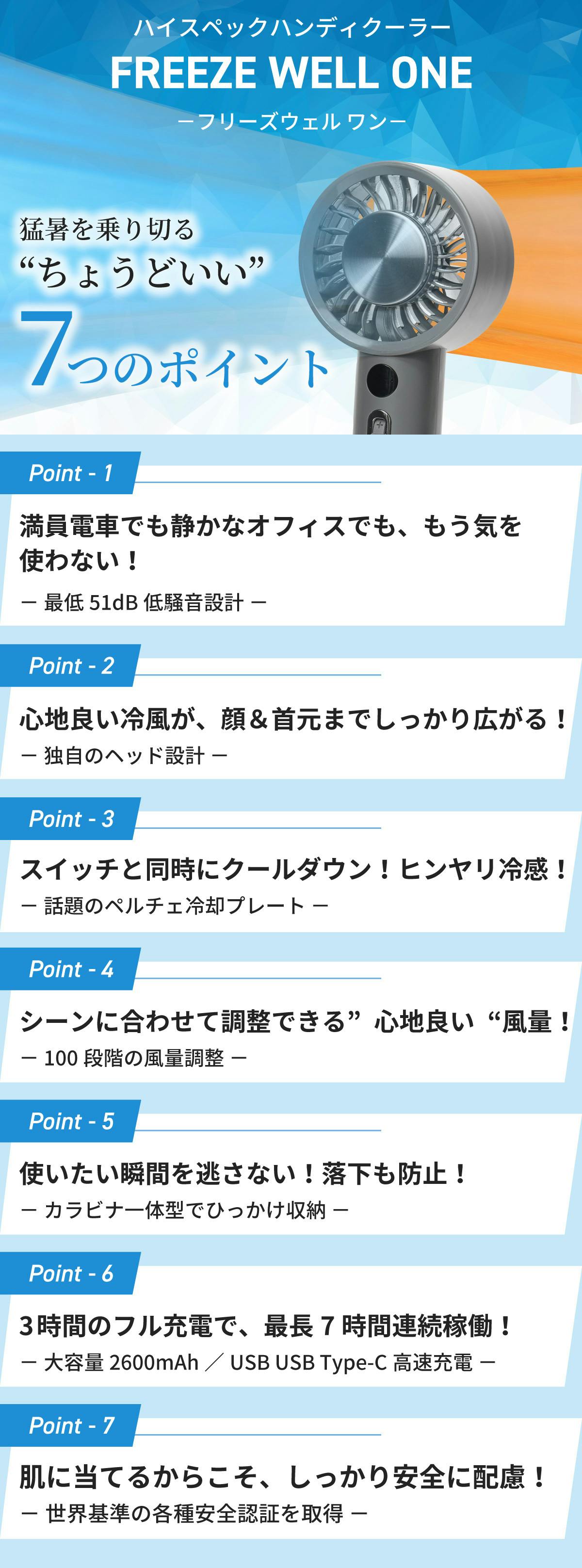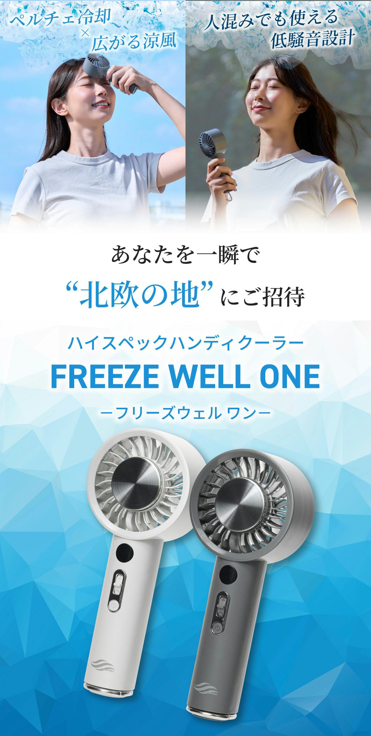 満員電車でも静かなオフィスでも、気にせずガンガン使える低騒音設計ハンディファン!独自のヘッド設計による最大風速約6mの広がる風が、顔&首元までしっかり冷却。さらに、話題のペルチェプレートがたった1秒で瞬冷約にクールダウン。Wの冷却力を“最低51dB”で実現する「FREEZE WELL ONE」登場!
