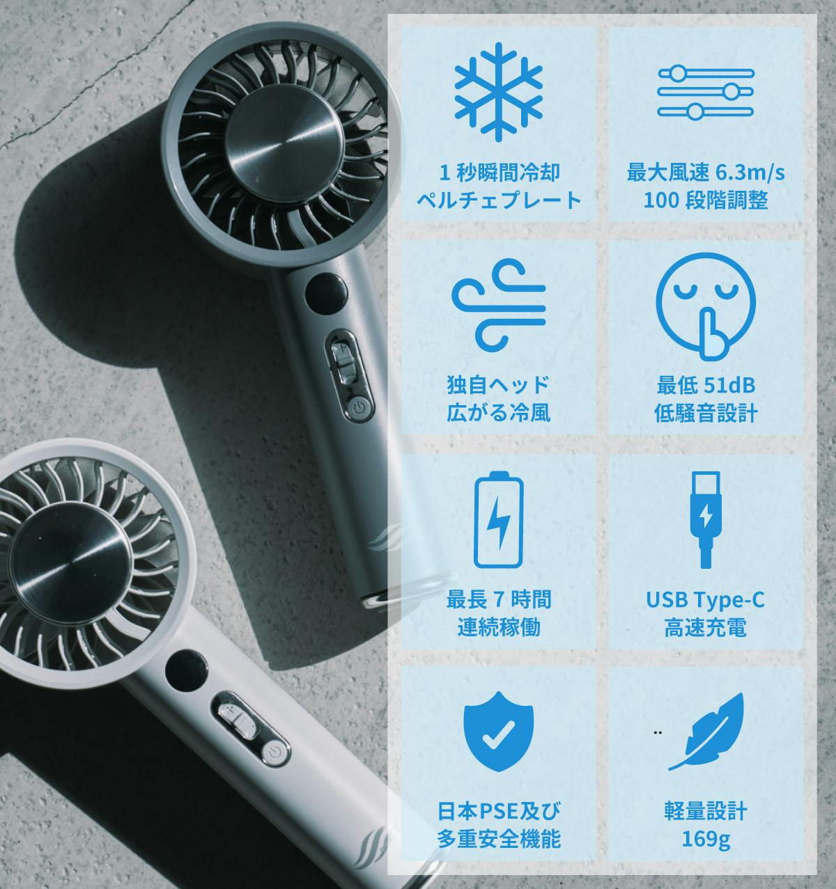 ペルチェプレートの“ひんやり感”独自ヘッドで広がる“心地良い涼風”による瞬冷体験を、「最低51dB」という日常生活で耳にする標準的な騒音レベルで実現。