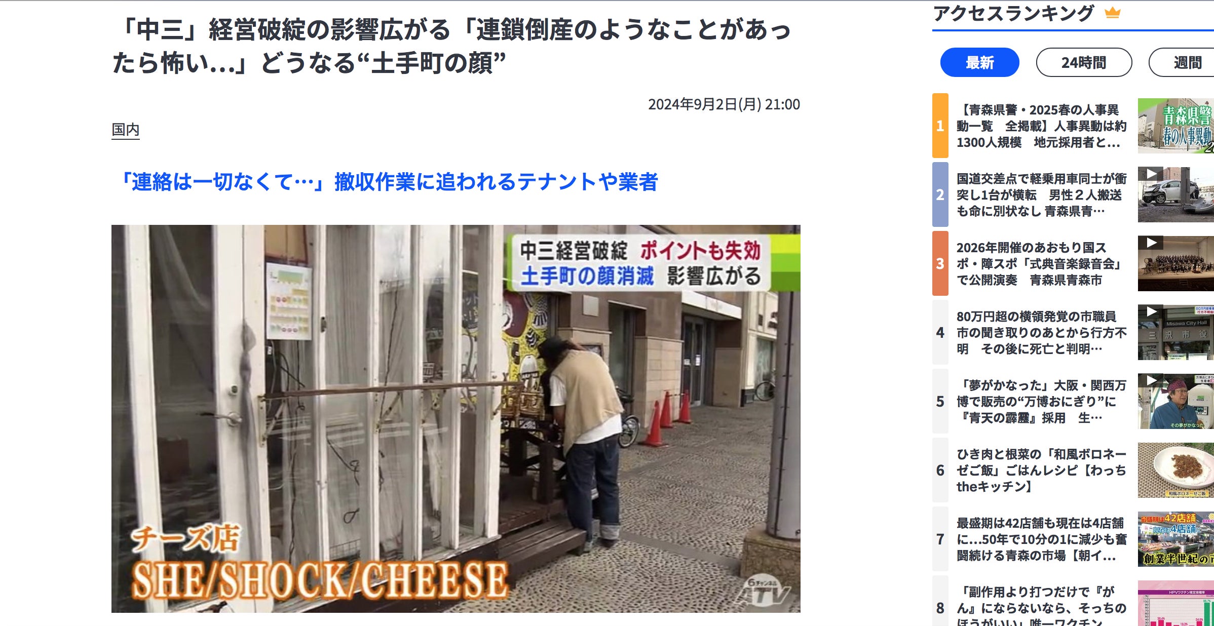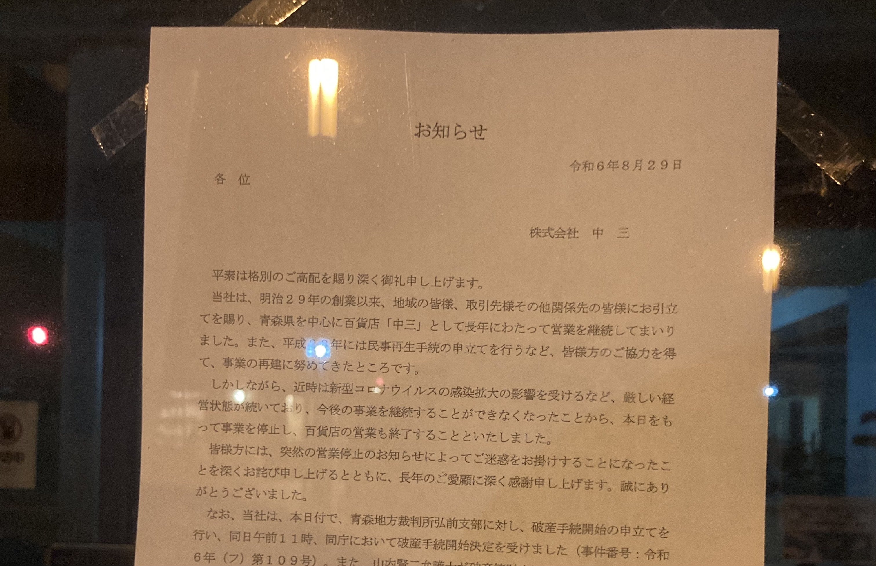 8/29に館である株式会社中三(中三百貨店弘前店)が突如として破産宣告を開始しテナントである当店も巻き添いを受け店舗を強制的に失うことになりました。