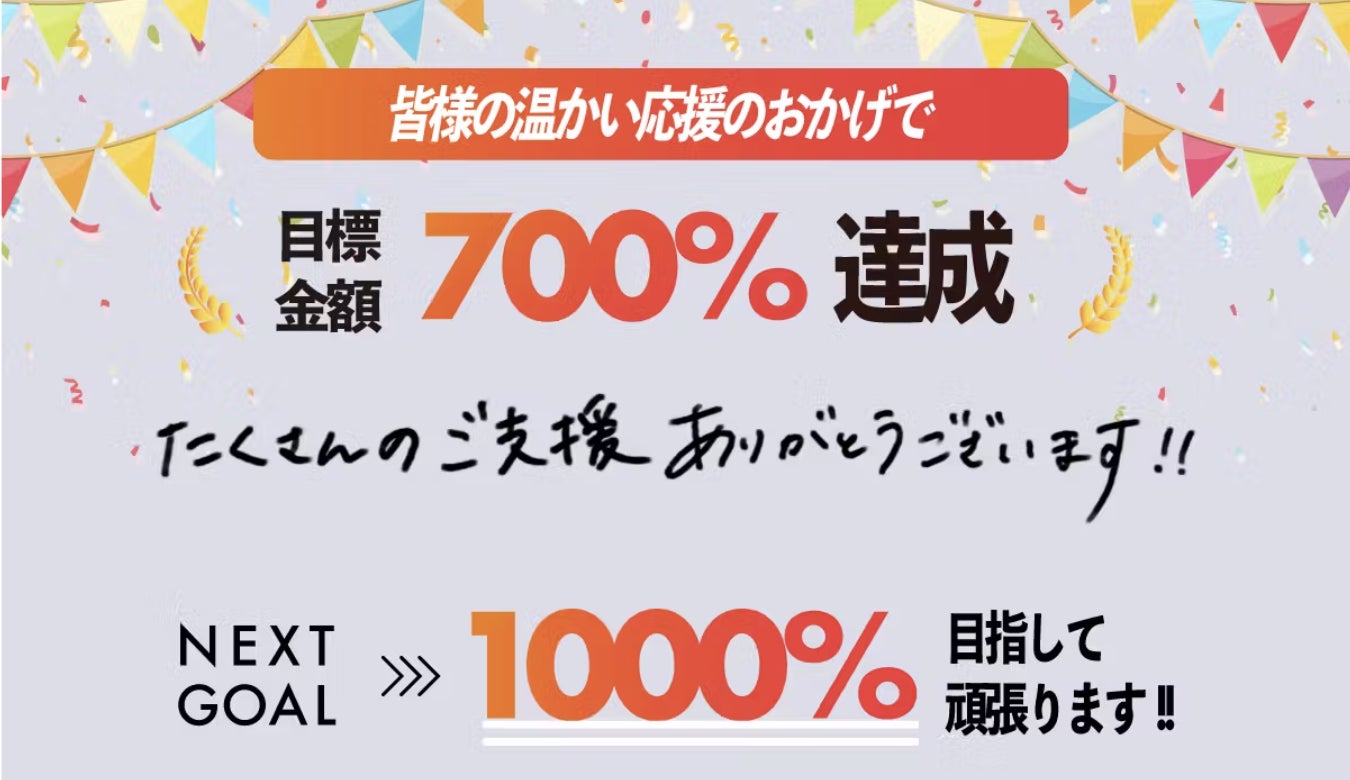 皆さまのご支援により達成率 700 %を突破し、追加ギガチャージ 7 %OFF クーポン(1 回分) のプレゼントが確定しました。心より御礼申し上げます。