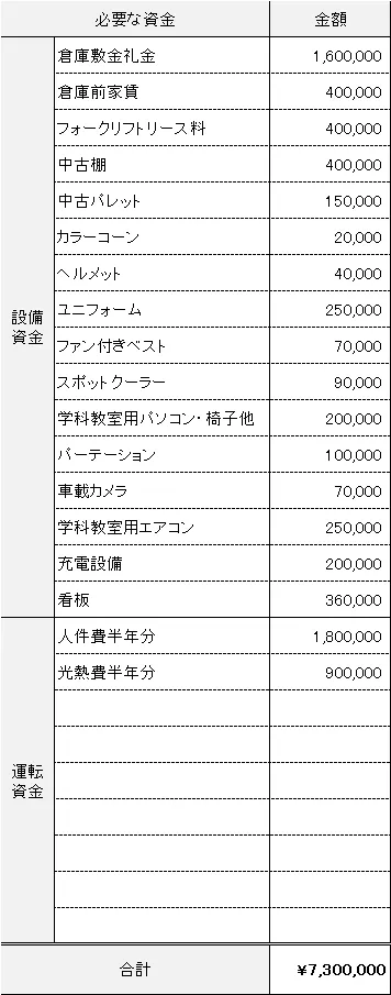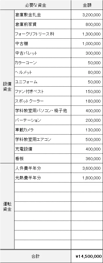 当スクールを開設するには、1,400万円の資金が必要です。最小規模の“ミニマムプラン”であっても、700万円は必要となります。