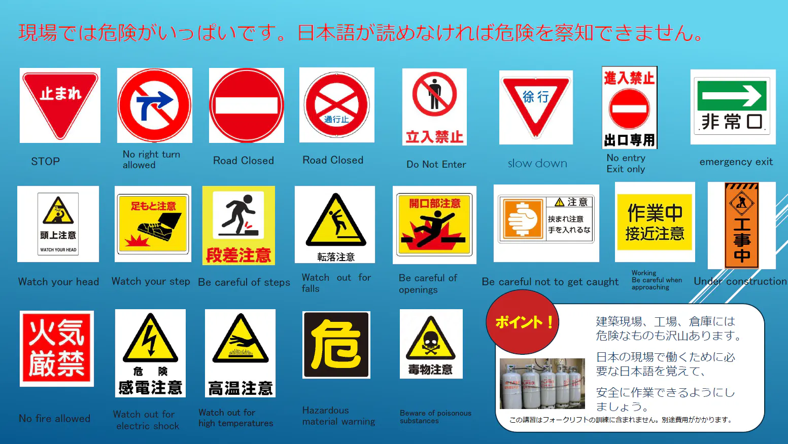 日本語がわからない方の為に、流通業、建築業で使用する日本語を別途講習していきます。