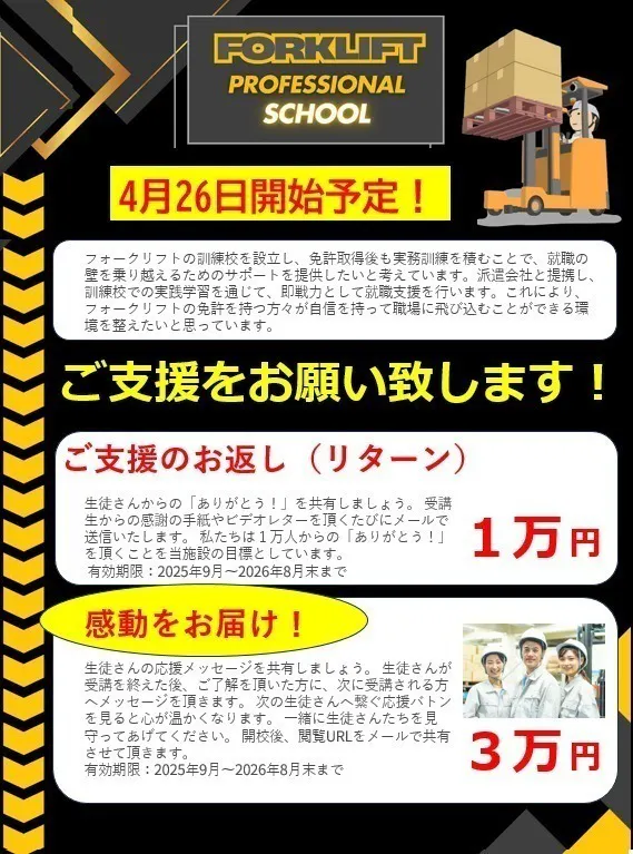 私たちのプロジェクトにご関心を持っていただき、心より感謝申し上げます。フォークリフトの訓練校を通じて、多くの方々が職場で活躍できるようになることを心から願っています。このプロジェクトの成功には、皆様のご支援が不可欠です。どうか、私たちのビジョンに共感いただき、一緒に未来を切り拓くお手伝いをしていただければ幸いです。皆様の温かいご支援をお待ちしております。