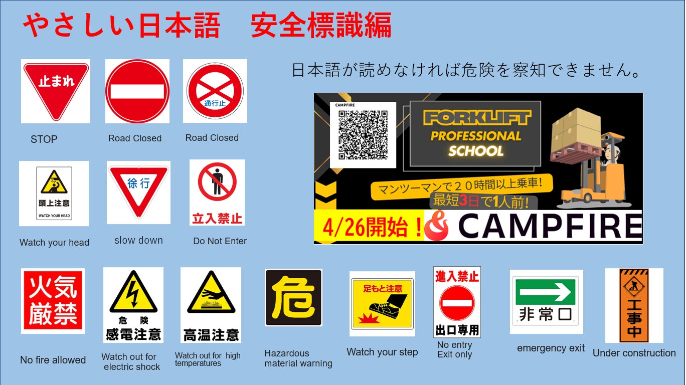当スクールでは、外国人講師が英語でフォークリフト技術の訓練を行います。ですが、現場で働くには「日本語の理解」がどうしても必要です。