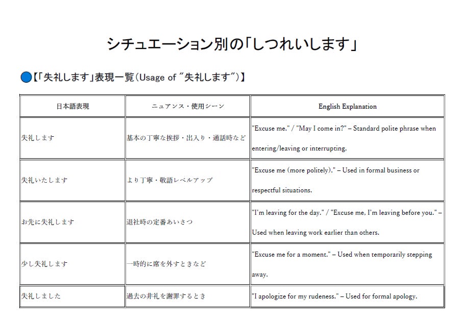 外国人労働者にとっては、特に出入りのマナー(上司の部屋、オフィス出入りなど)でこの表現が使えると信頼につながります。