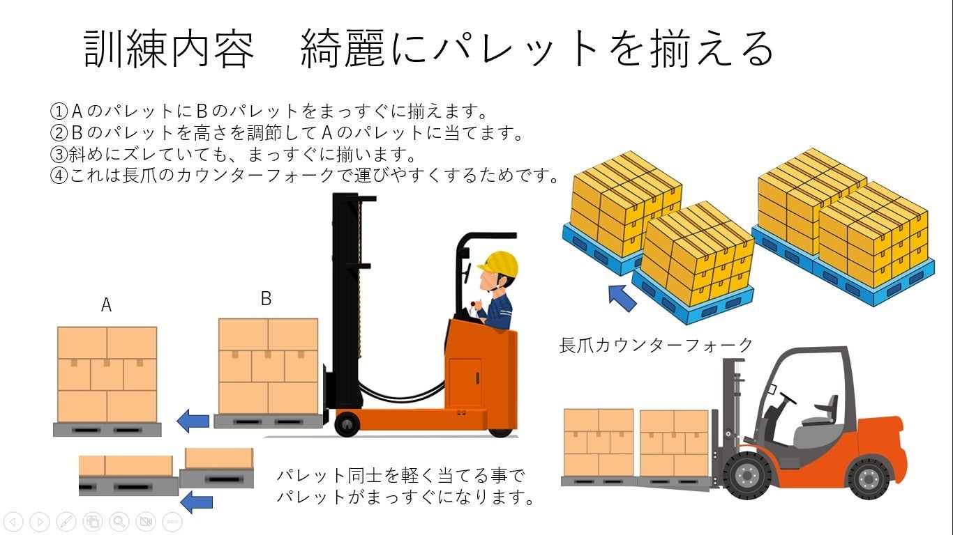 その上で、パレットの端をまっすぐに合わせるように降ろすことで、パレットの「間口」(フォークが入る穴)がそろい、長爪フォークがスムーズに差し込める状態になります。