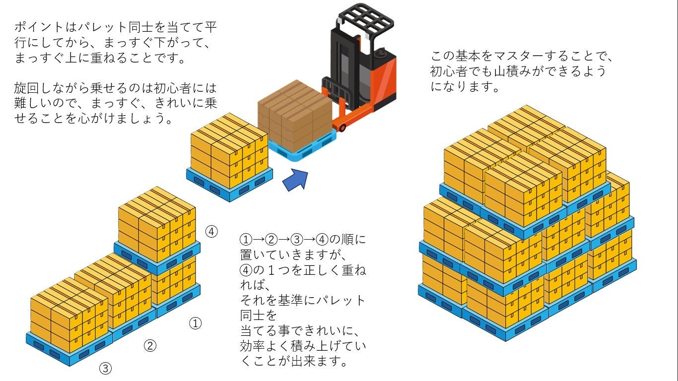 平場で重要になるのが、パレットを正確かつスピーディに段積みする技術=“山積み”です。