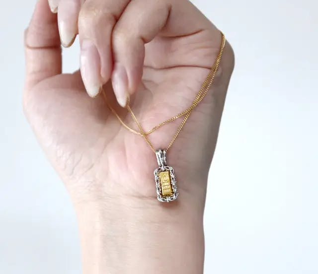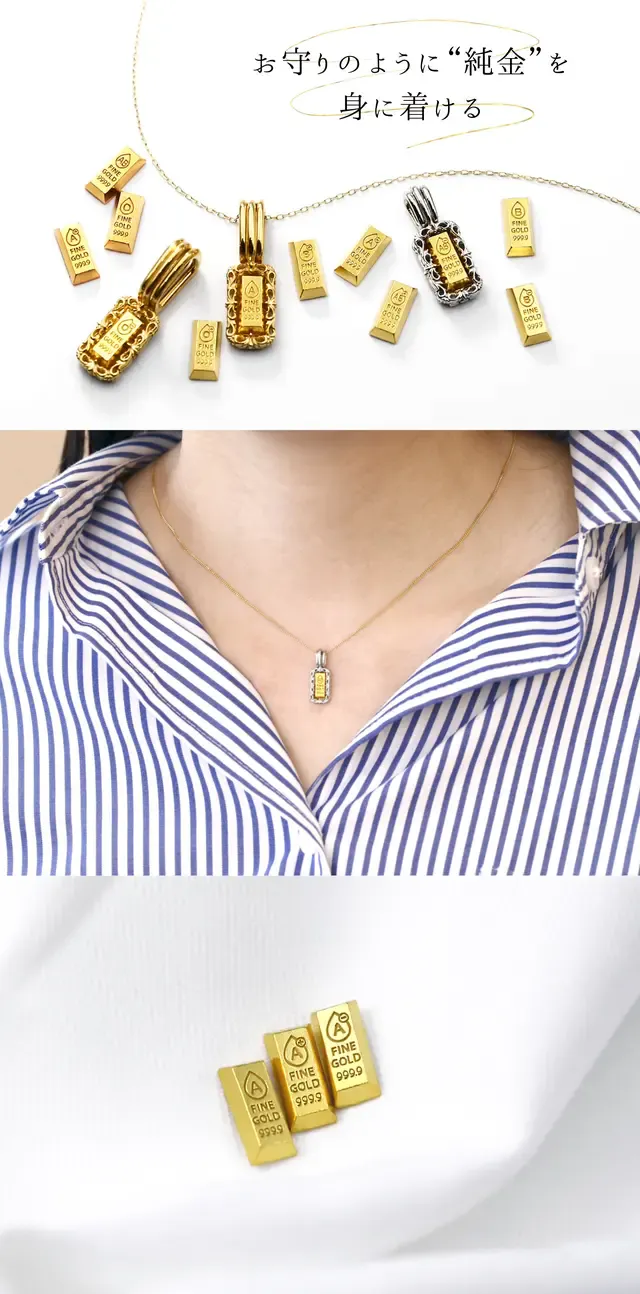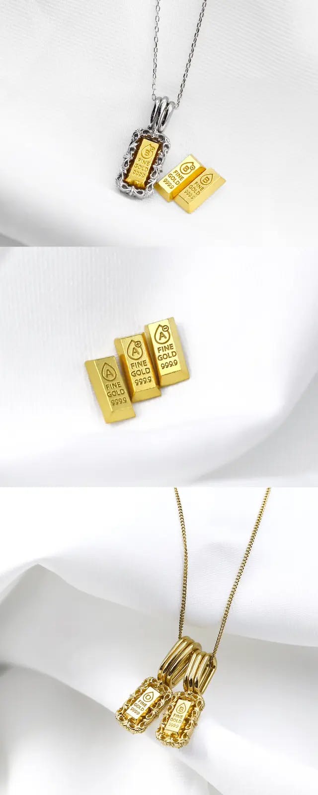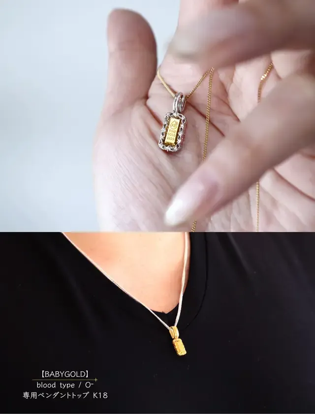 専用ペンダントトップに入れてジュエリーに。専用ペンダントは中身のBABYGOLDを入れて取り外しも自由です。