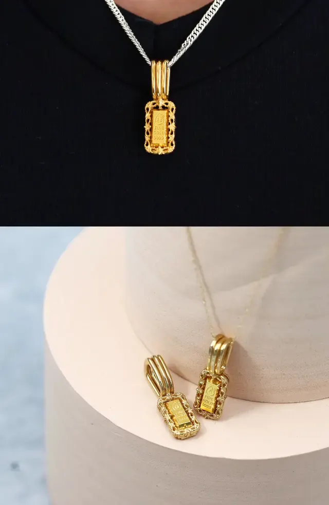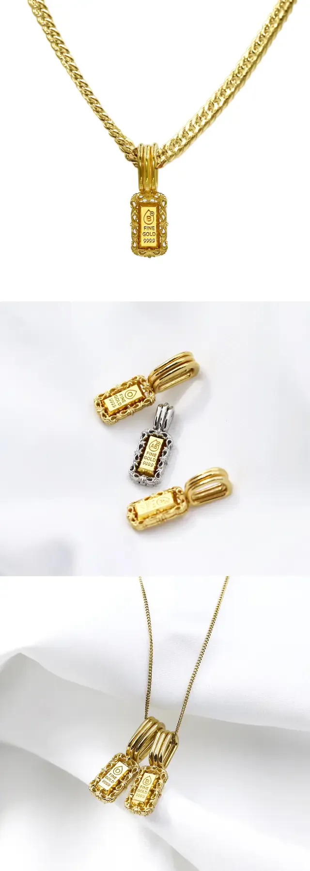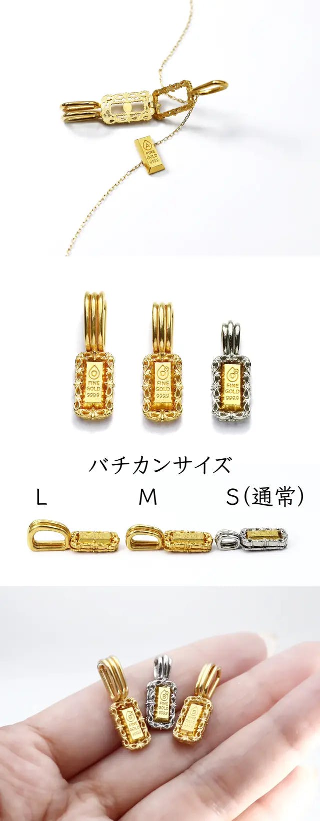 専用ペンダントトップに入れて、ジュエリーとしても身に着ける事ができます。今回は太めのチェーンが通るバチカンサイズ「M」と「L」も仲間入りしました。Lサイズはダブル喜平ネックレスの中折れ式クラスプも通ります。