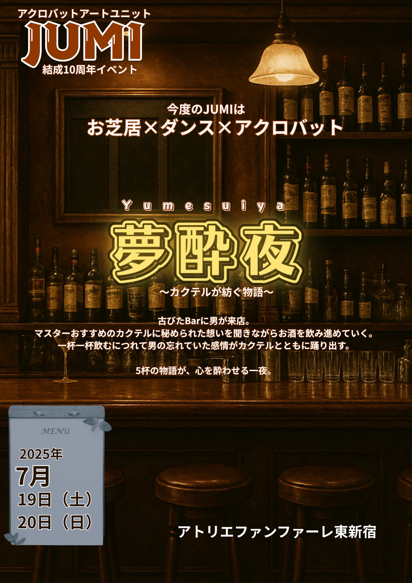 2025/07/21 06:39【夢酔夜、閉幕】たくさんのご声援、ありがとうございました。皆さんこんにちは。主催のあつしです。2025年7月19日・20日の二日間にわたって開催された、JUMI10周年記念公演『夢酔夜〜Yumesuiya』。全4公演、無事に終演いたしました。まずはこの場を借りて、支えてくださったすべての皆さまへ。本当に、本当にありがとうございました。クラウドファンディングでのご支援から始まり、ご来場くださった方、遠くから応援してくださった方、情報をシェアしてくれた方──皆さま一人ひとりの想いが、私たちの背中を押し、この舞台を形にしてくださいました。全てが“手作り”。そして“挑戦”。今回の『夢酔夜』は、私たちにとって新しい挑戦でもありました。お芝居×パフォーマンスの融合。脚本、構成、音楽すべてがオリジナル。「ゼロから作品を創る」という、まさに10周年の節目にふさわしい内容でした。初めてのことに苦戦しながらも、全員が最後まで諦めず、「伝えたい」という想いだけを原動力に走りきりました。そして、何より皆さまがいてくださったからこそ、私たちは“エンターテイナー”でいることができました。終わっても終わらない余韻。グッズ販売と応援メッセージのご案内終演後も、「夢酔夜」の余韻をお届けしたい。そんな想いから、いくつかの“記憶”を形にしました。・リハーサルドキュメント映像(約1時間予定)価格:2,000円(税込)舞台裏での葛藤、笑顔、ぶつかり合い?、仲間との絆。この作品がどう生まれたのかを、まるごと詰め込んでいます。・オリジナルサウンドトラック価格:1,000円(税込)全編オリジナル音源。劇中の空気を彩った音楽たちを、ぜひご自宅でも。・演者応援人企画、始動!さらに今回は特別に、演者一人ひとりへあなたの気持ちを直接届けられる「演者応援」企画を実施いたします。グッズ購入時に+αの応援金を加えていただくことで、そのまま演者本人へあなたの応援メッセージと一緒にお届けします。※ 応援メッセージは文字数制限なし!※あなたの言葉が、演者の次の一歩を支えてくれます。グッズ販売含め募集締切:2025年8月15日まで最後に今は、まだ胸の奥がぽっかり空いているような、不思議な気持ちです。でもきっと、また次に進むための準備期間なんだと思っています。イベントの開催って、はっきり言って‥‥めちゃくちゃ大変です(笑)やることいっぱい。しかも今回は全てが手作り。だけど、観てくれた人が「また観たい」「元気が出た」「泣いた」「笑った」──そんな言葉を残してくれるたびに、私たちはまた立ち上がるのです。だからまた、きっとお会いしましょう。今度はどんな形になるか分かりませんが、また一緒に笑える日を楽しみにしています。あなたと過ごせたこの奇跡の時間に、心からの感謝を込めて。またお会いしましょう。ありがとう。── あつし / JUMI もっと見る