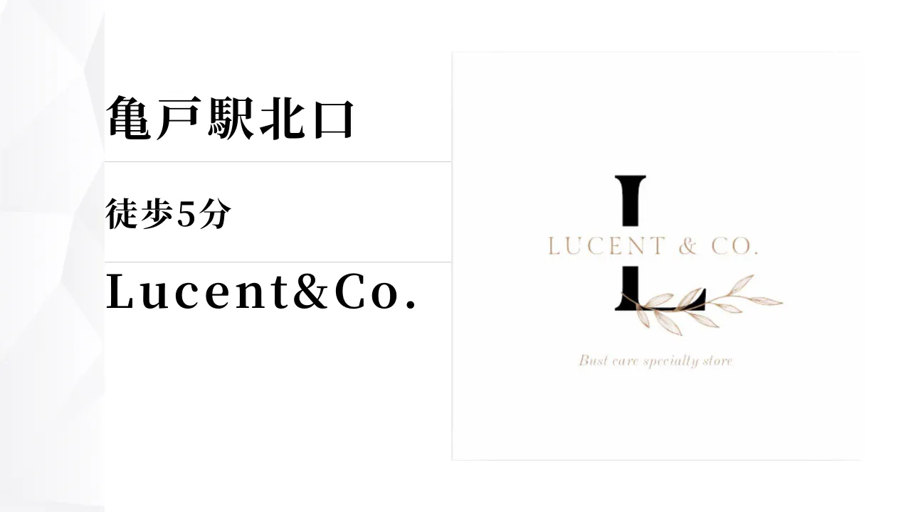 はじめまして。東京・亀戸駅北口にある【女性専用バストケア専門店】「ルーセントアンドコー(Lucent&Co.)」です。